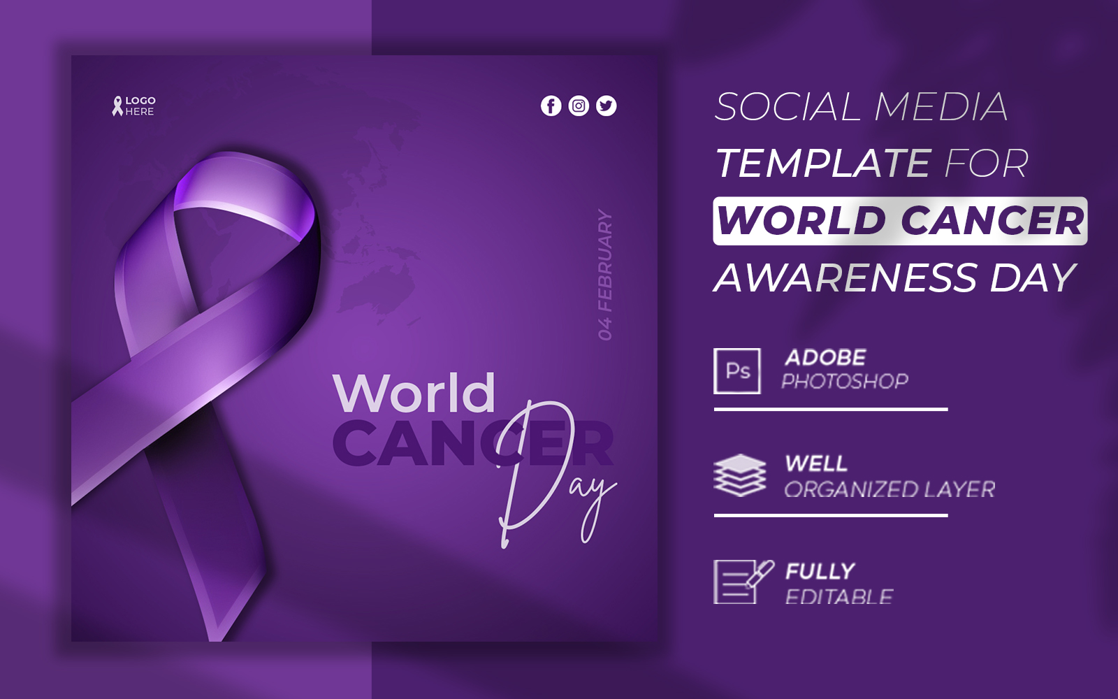 Hi, This is Excellent World Cancer Day Creative 3d Social Media Post Template, All Element are Fully Vector, Editable and Ready to Printing, They are 100% Editable and Scalable without Losing Resolution, so easy to resizing and customizing.