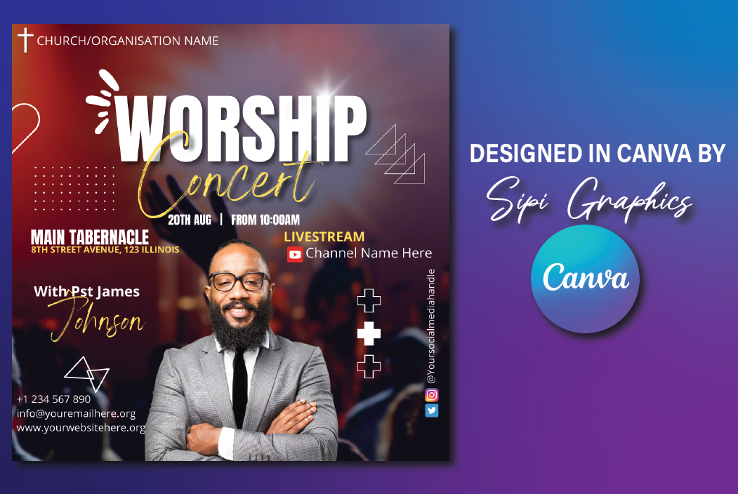 This is a Concerts Flyer template made for religious concerts such as worship experiences and gospel concerts. The template is designed in Canva because of its ease of use even for non-designers. It is made with free elements and appropriate colour scheme that can be changed within Canva at no extra cost.