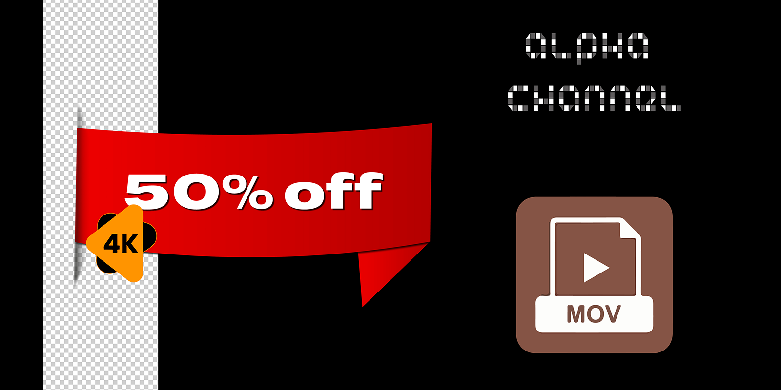 Animated red ribbon with a 50% off discount in 4K format with alpha channel (transparent background). Perfect for promotional videos, online stores, social media, promotions, and sales. Video in .MOV format