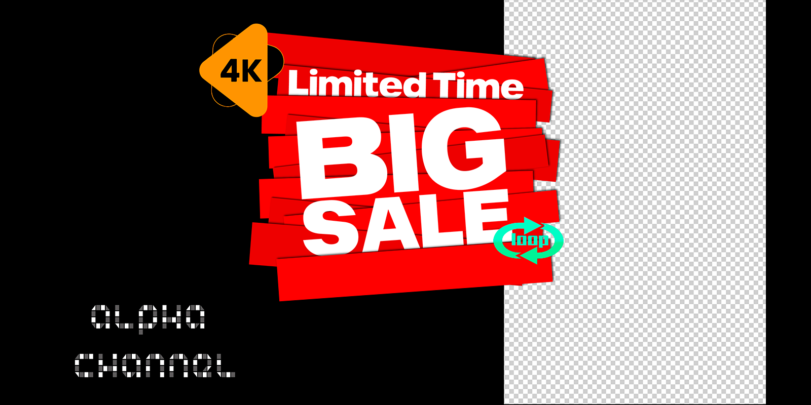 Bright animated insert “Limited Time BIG SALE” in 4K format with a transparent background (alpha channel). Ideal for use in video ads, social media, promotional videos, e-commerce, and presentations. The animation is loop-ready, which ensures continuous repetition without seams. Suitable for overlaying on other videos or backgrounds. Video format: .MOV.