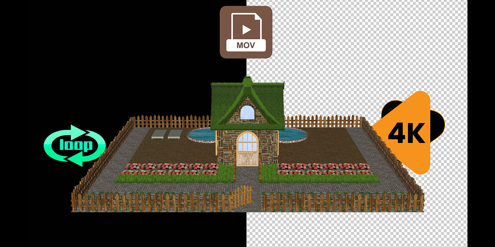 A 3D loop animation of a charming house with a green roof, flower garden, swimming pool and decorative fence. The video is saved in .mov format with an alpha channel (transparent background), which makes it easy to integrate into any video project. Ideal for fairy tale scenes, presentations, games, children's videos or visual effects. Available in 4K resolution for high quality visualization.