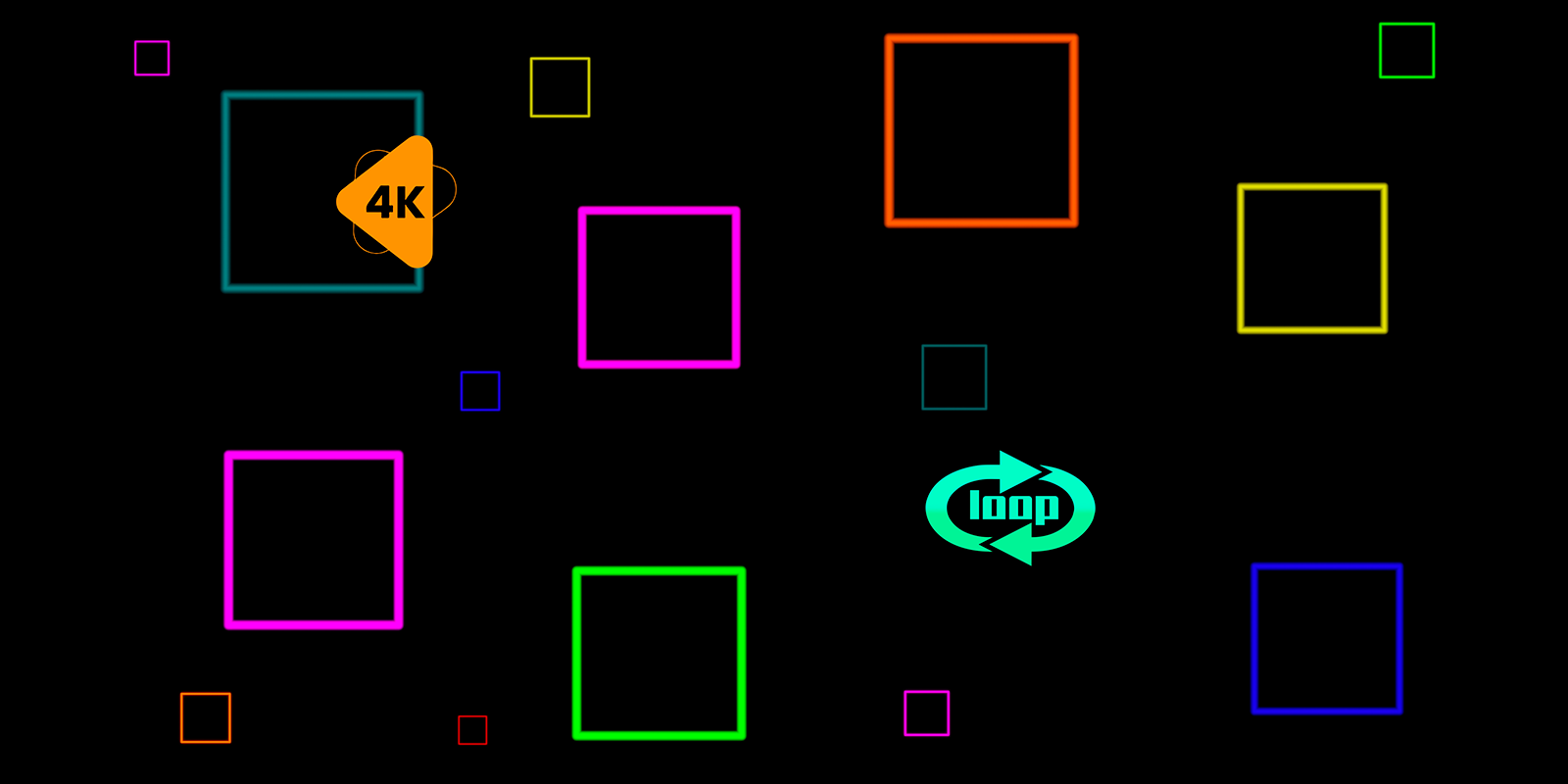 Animation with smoothly appearing and disappearing neon squares of different sizes on a black background. The squares randomly change their position, creating a dynamic and abstract effect. Perfect for video backgrounds, screensavers, or VJ visualizations. Available in 4K quality and loop mode.