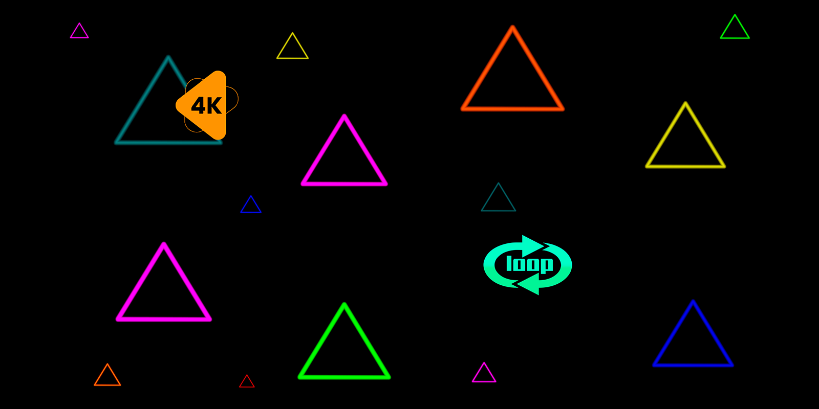 Animation with smoothly appearing and disappearing neon triangles of different sizes on a black background. The triangles randomly change their position, creating a dynamic and abstract effect. Perfect for video backgrounds, screensavers, or VJ visualizations. Available in 4K quality and loop mode.