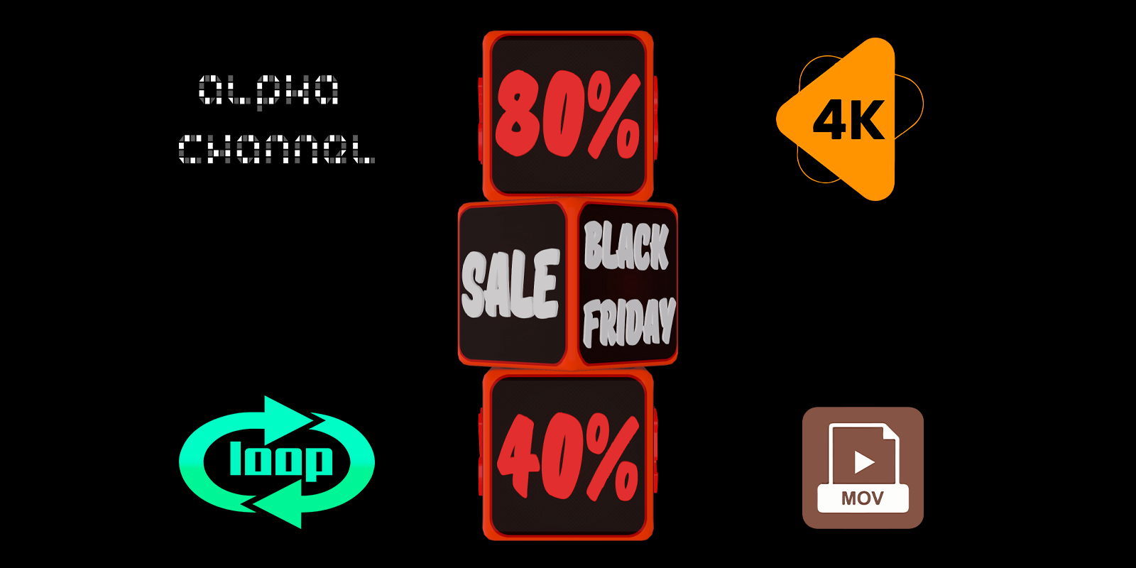 Black Friday is a video where dice with discounts and special offers are spinning, creating a dynamic atmosphere of exciting sales. The spinning dice add energy and intrigue to the video, making it perfect for promoting crazy discounts and Black Friday deals. 4k, alpha channel, looped.