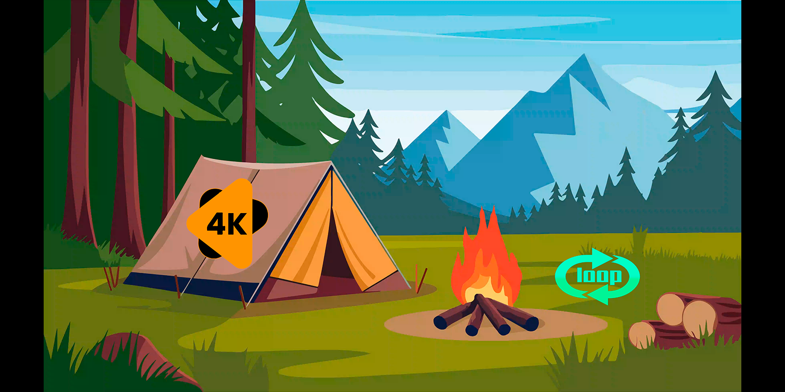 Camping is a 4K animation that shows a cozy camping scene in the forest near the mountains: a tent, a campfire, surrounded by natural beauty. The looped format provides continuous motion, creating the perfect atmosphere for screensavers, intros, relaxation videos, or adventure projects.