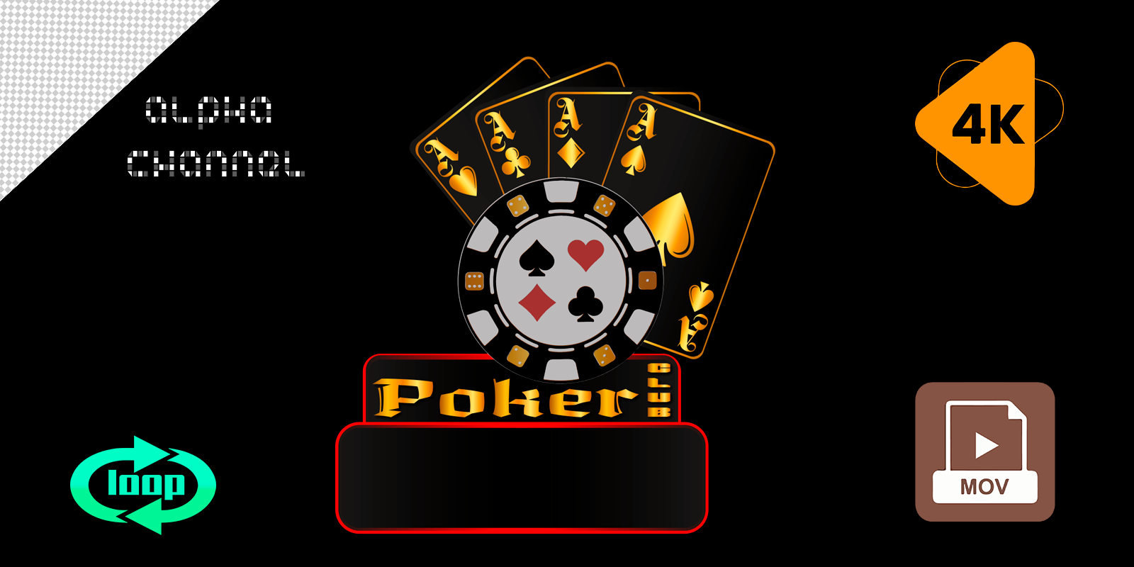 This video shows four aces of different suits arranged around a rotating chip with the inscription 'Poker Club'. The video is produced in high 4K resolution and has a transparent background (alpha channel), which makes it easy to integrate into any media project. It is an ideal solution for use in commercials, video presentations, or graphic projects dedicated to poker or casinos. Poker elements and dynamic animation create an atmosphere of excitement and play.