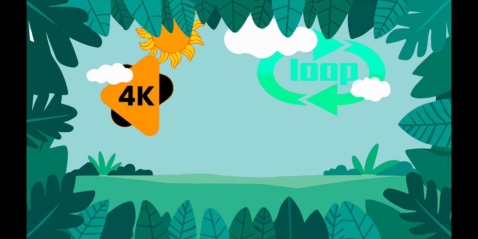 Animated background with a painted landscape. Green leaves, pale blue sky and fluffy clouds create an atmosphere of peace and harmony. Perfect for children's videos, fairy tales, educational videos and animation projects.