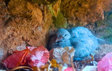 A delicate baby bird rests peacefully in its rocky nest, nestled among dry leaves that rustle gently in the breeze. The scene captures a serene moment in nature, highlighting the tranquility and simplicity of the bird's habitat. The nest, carefully constructed with twigs and leaves, blends seamlessly with the rocky surroundings, providing both camouflage and protection. The baby bird, with its soft downy feathers, looks calm and content, embodying the innocence and beauty of wildlife. The dry leaves add a rustic charm to the setting, their earthy tones complementing the rugged texture of the rocks. This moment is a testament to the harmony of nature, where even the smallest creatures find their place and peace