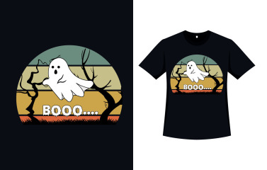 Halloween black color T-shirt design with vintage colors and a scary white ghost and also dead trees silhouette. Halloween element silhouette design with a spooky ghost, dead trees, and calligraphy. Spooky T-shirt design for Halloween with retro colors.