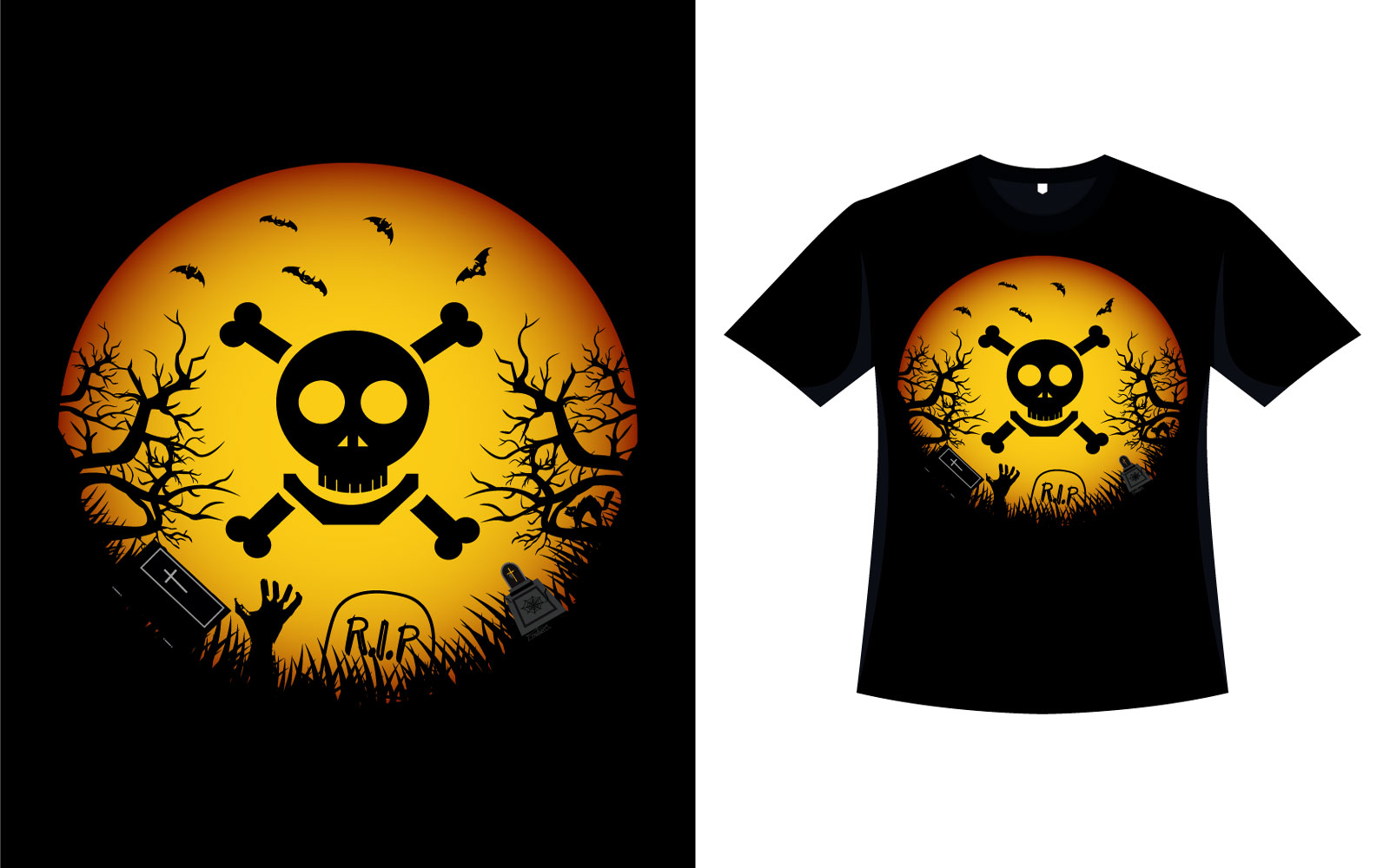 Halloween black color T-shirt design with vintage colors and a scary skull and also with dead trees silhouette. Halloween element silhouette design with a spooky skull, dead trees, zombie’s hand, tombstone, and calligraphy. Spooky T-shirt design for Halloween with retro colors.