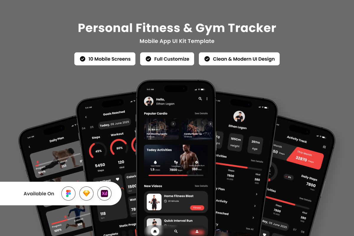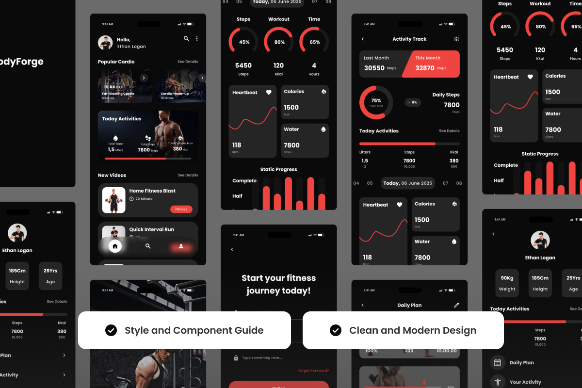 A bold and cutting-edge mobile app design for fitness lovers and gym-goers. With its modern layouts, motivational themes, and comprehensive tracking capabilities, this template is perfect for creating an app that inspires users to forge their fitness journey with confidence and style.**Highlights:**