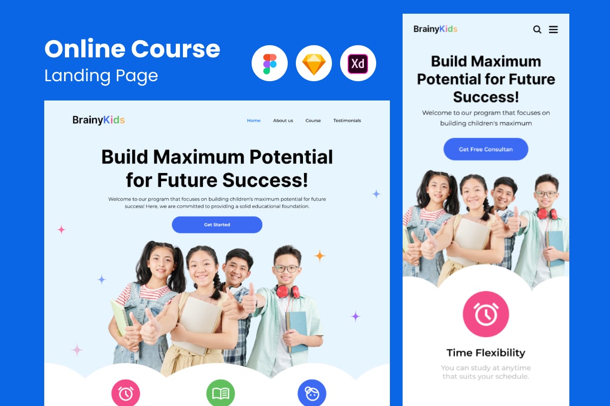 BrainyKids presents an innovative UI/UX design for online course landing pages. This design features a kid-friendly approach with an easy-to-understand layout and bright colors.