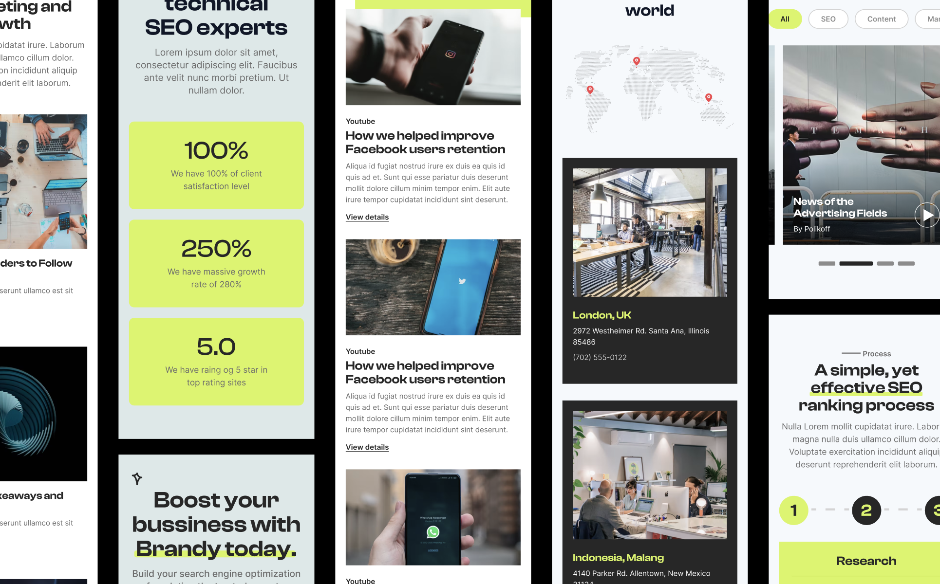 Brandy Digital Marketing Agency Website UI Kit will help your Digital Marketing Agency services. Came with clean and professional style, you can easily edit and customize all elements with design component which can speed up your design process.