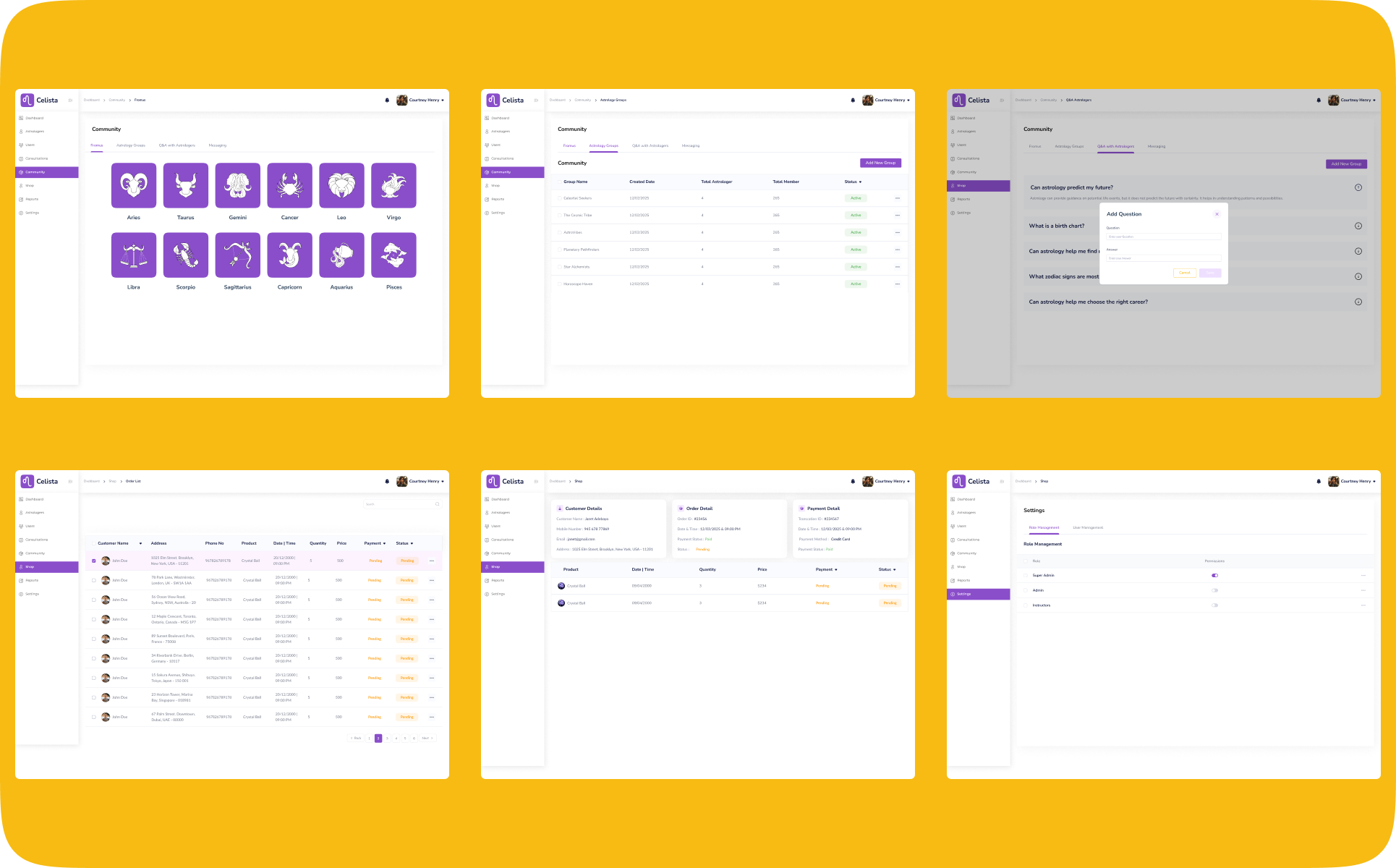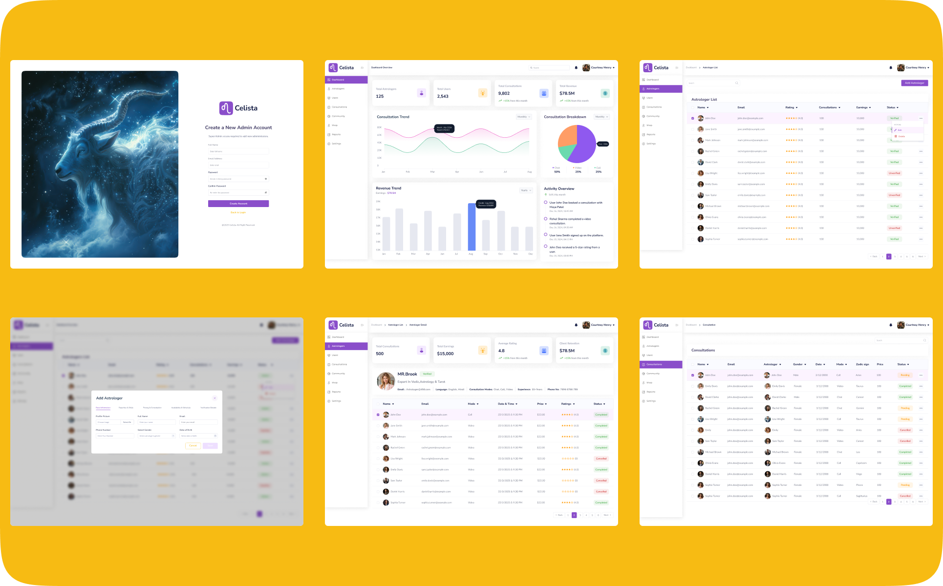 The Celista Astrology Admin Dashboard UI Template is a modern and intuitive design solution tailored for astrologers, horoscope analysts, and spiritual consultants. It features a user-friendly interface for managing astrology readings, tracking user queries, scheduling consultations, and analyzing astrological data. Fully customizable and responsive, this template ensures seamless access across all devices. Ideal for developers and astrology businesses, Celista provides all the essential tools to streamline operations, enhance client engagement, and optimize astrology service management.