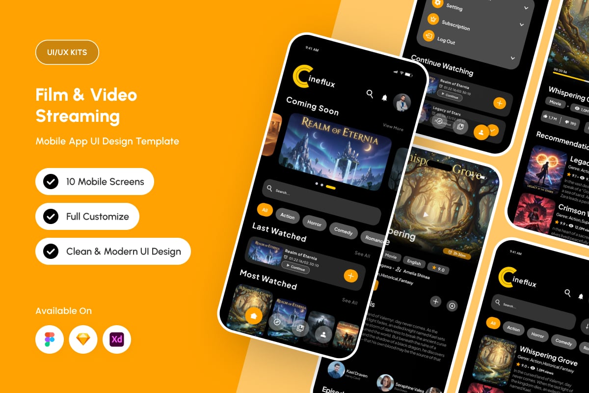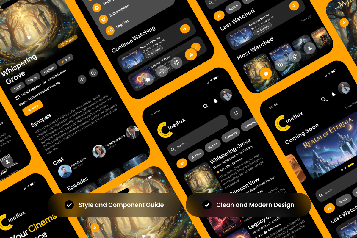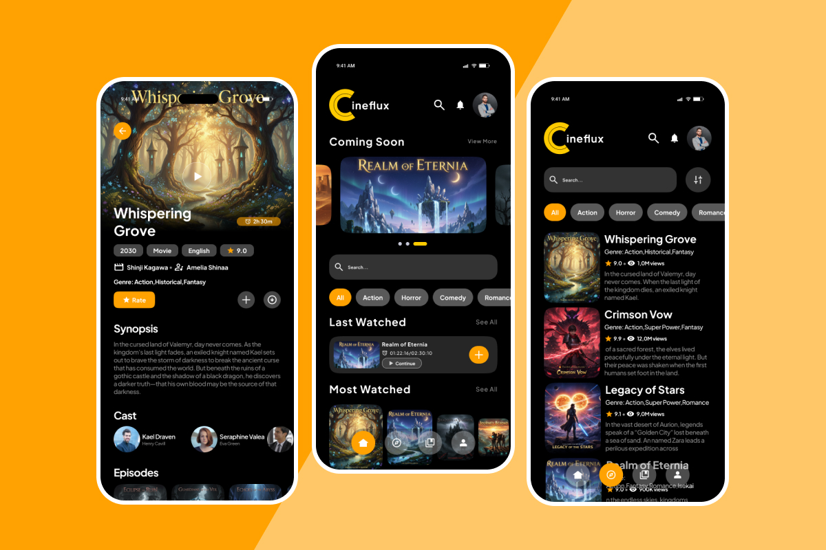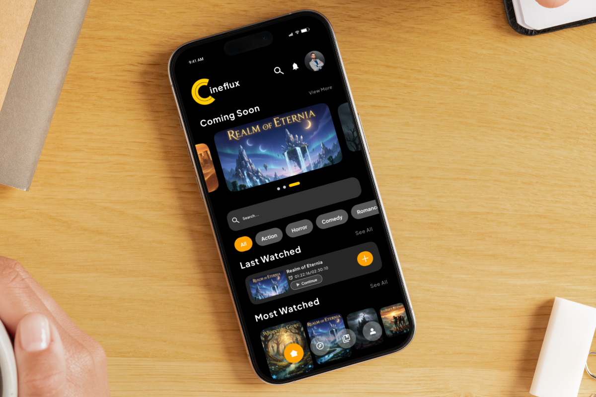 Cineflux offers an elevated streaming experience with bold visual rhythm and cinematic precision. Ideal for entertainment brands or creators wanting to design high-quality apps that merge intuitive UX with storytelling and film discovery.
