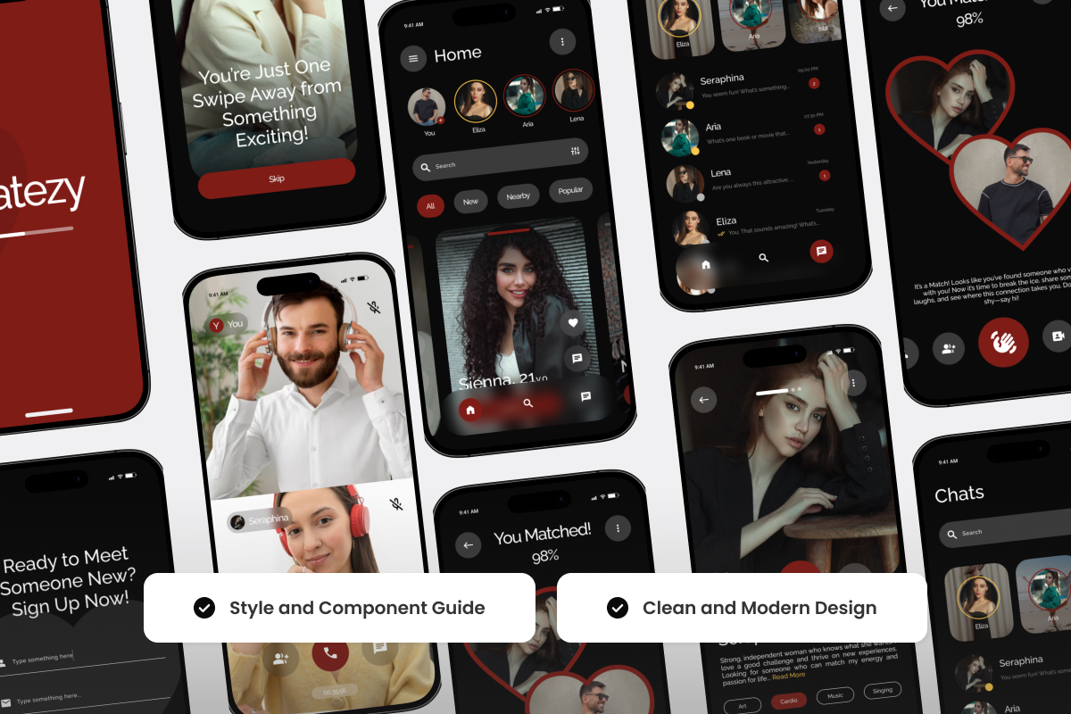 Create a sleek, engaging dating platform with Datezy, a modern social dating app UI kit. Featuring bold typography, vibrant layouts, and user-friendly components, it’s designed to enhance the online dating experience. Ideal for startups, designers, and entrepreneurs looking to develop a high-quality app.**Highlights:**