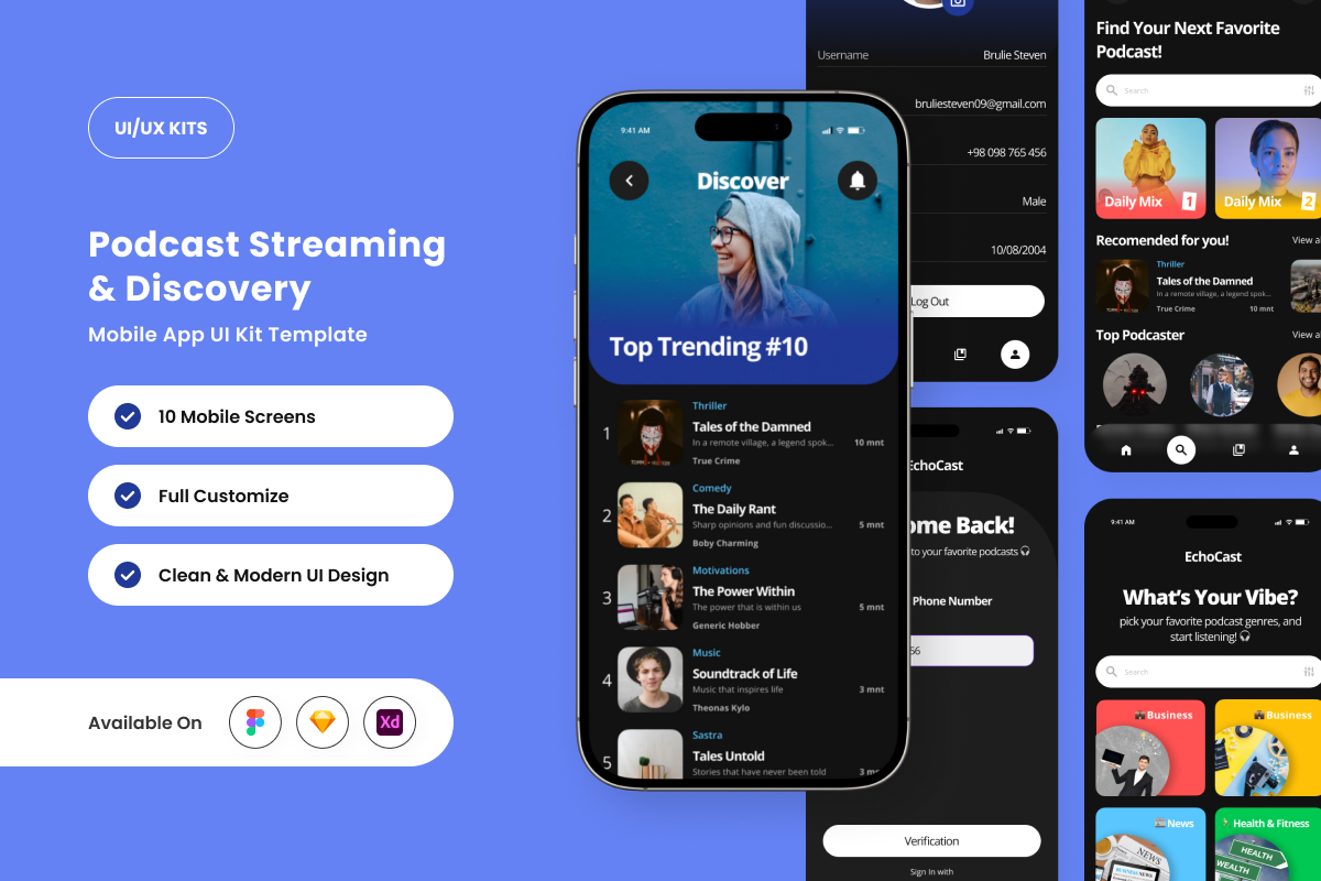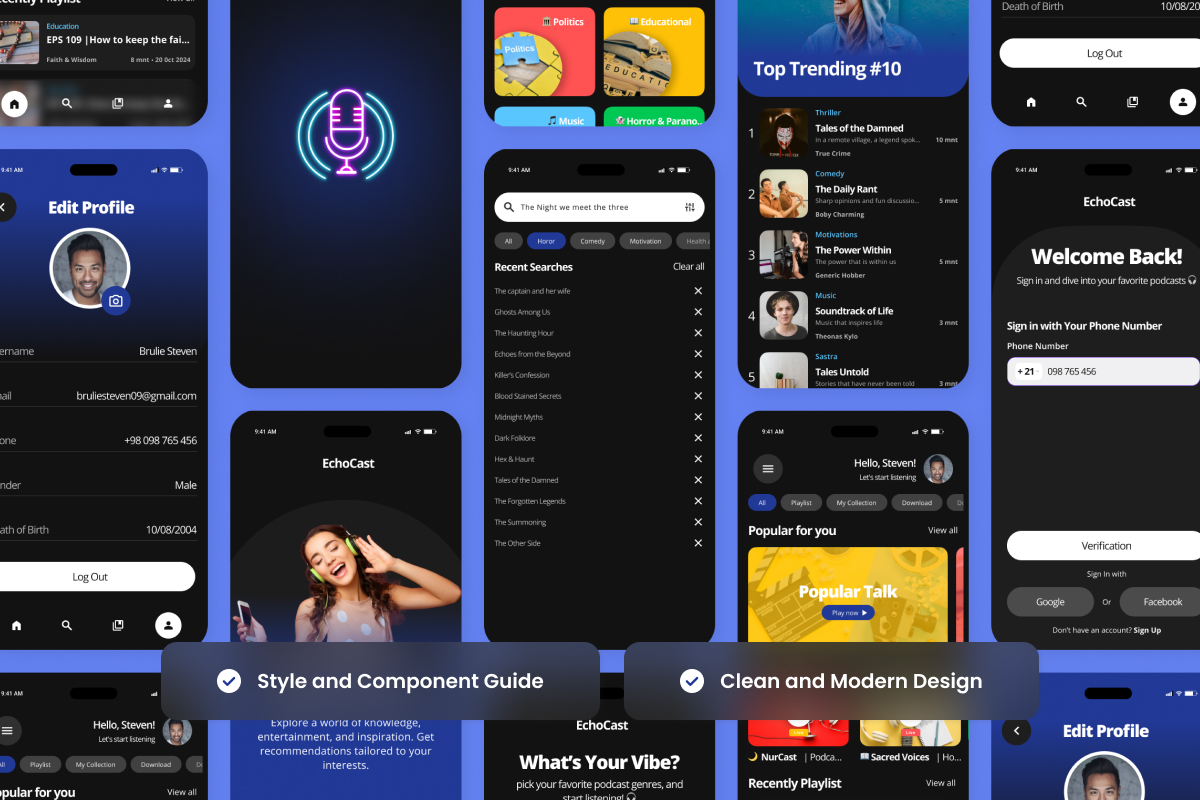 EchoCast is a clean and professional podcast UI design built for an enhanced listening experience. Featuring well-structured layouts, elegant typography, and intuitive navigation, this UI kit is perfect for podcast streaming, music platforms, and talk shows.