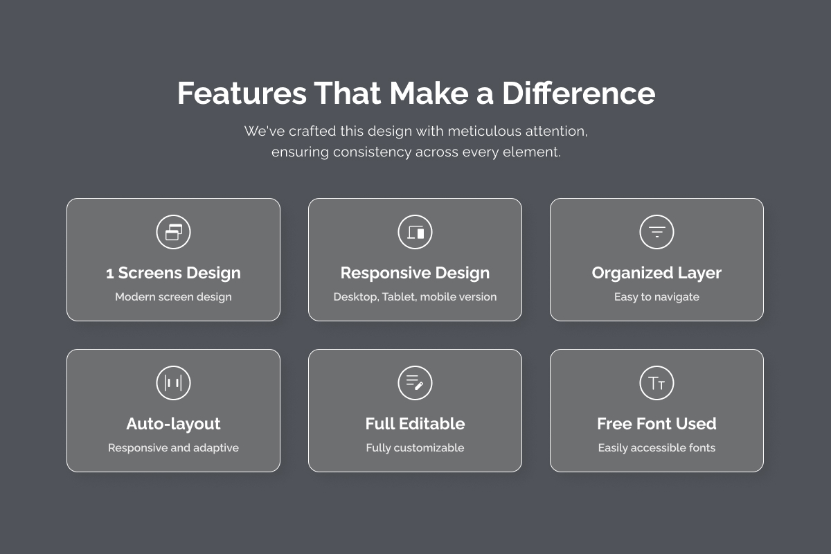 This premium Kit offers modular components and clean Organized Layers. The design is entirely Responsive and Adaptive, covering well-organized Desktop, Tablet, and Mobile layouts. Leveraging the Auto-Layout feature, AXIV allows designers and creative teams to achieve rapid customization, as all elements are fully editable and utilize only free fonts. This ensures your design workflow is highly efficient, seamless, and developer-friendly for quick deployment.