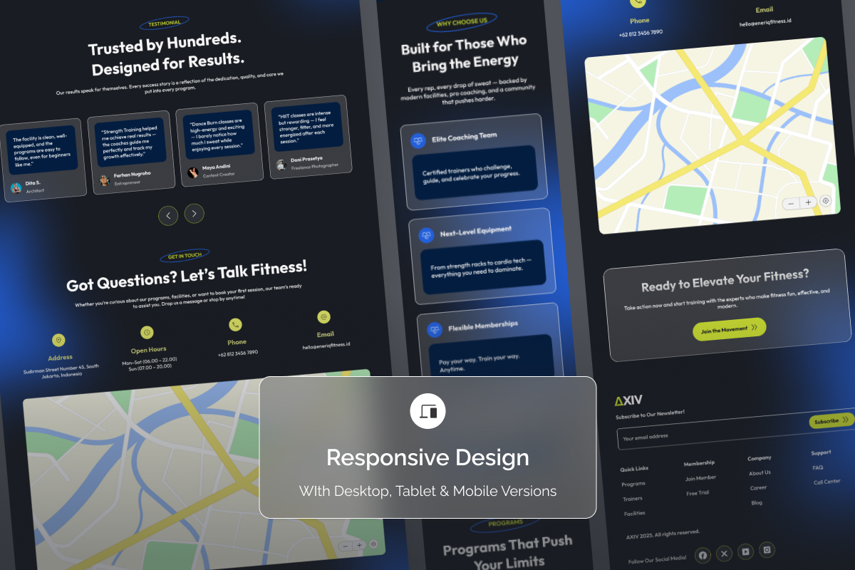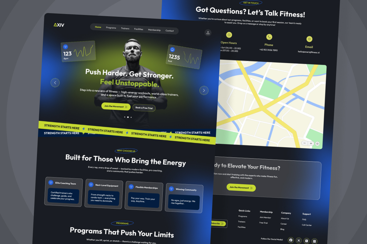 The AXIV Modern Fitness Landing Page UI Kit is a high-energy design strategically engineered to maximize membership sign-ups and lead generation within the wellness industry. Featuring a potent mix of strong color contrast, clean typography, and a sporty grid composition, this UI Kit effectively communicates strength, motion, and peak performance. It’s the ideal all-in-one solution for Gym Websites, Fitness Studios, Personal Trainers, or Health Startups looking to guide visitors toward action with a highly professional presentation.