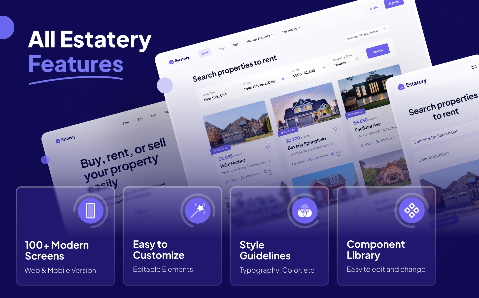 Estatery Web and Mobile UI Kit will help your Property SaaS & Real Estate Web App products or services. Came with clean and professional style, you can easily edit and customize all elements with design components which can speed up your design process.