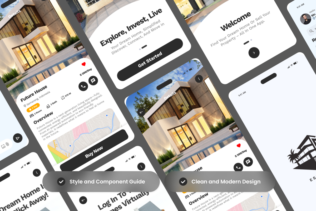 Estatour is a modern UI kit designed for real estate apps featuring immersive virtual tours. With intuitive layouts, property highlights, and booking features, it helps users explore, experience, and reserve their dream homes directly from their devices.**Highlights:**