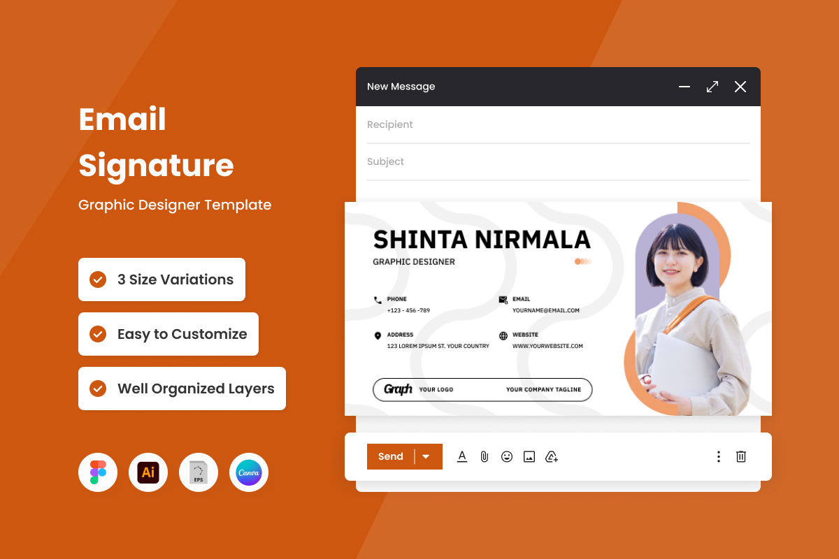 A modern and eye-catching email signature template designed for graphic designers. With a focus on creativity, this template helps you present your contact details in a visually appealing and professional manner.