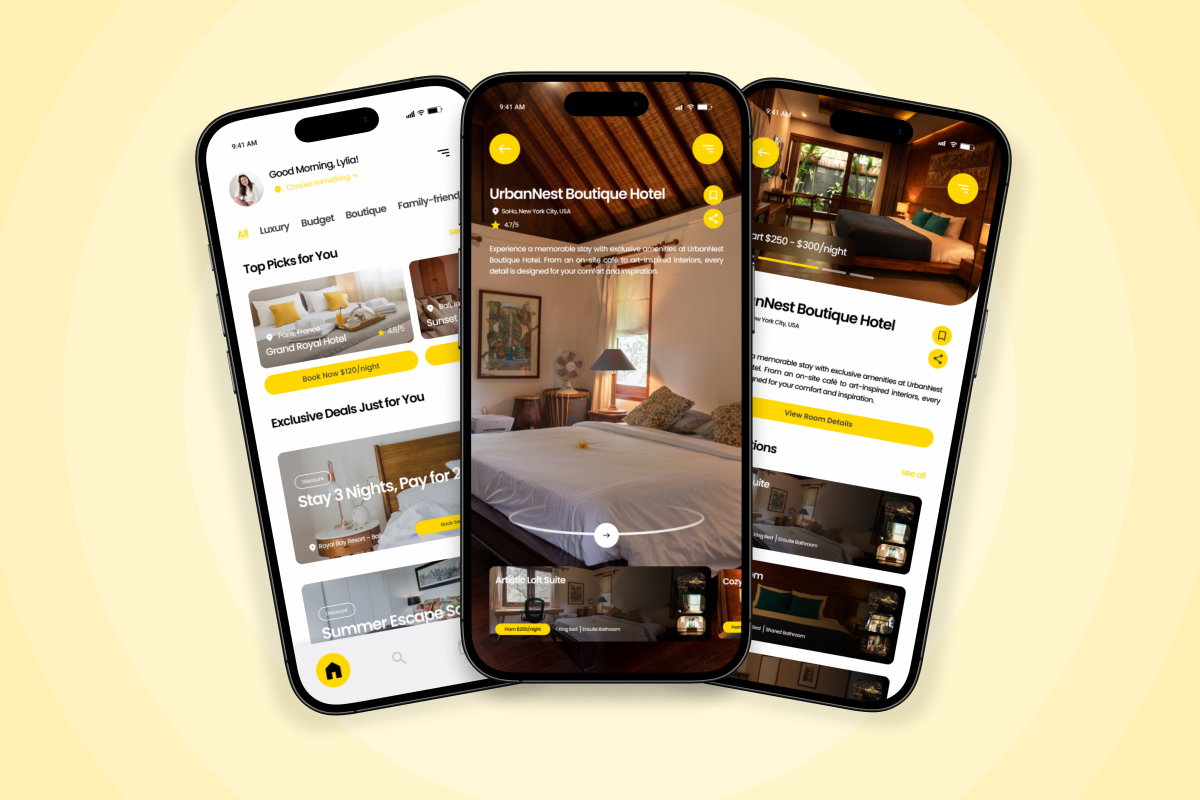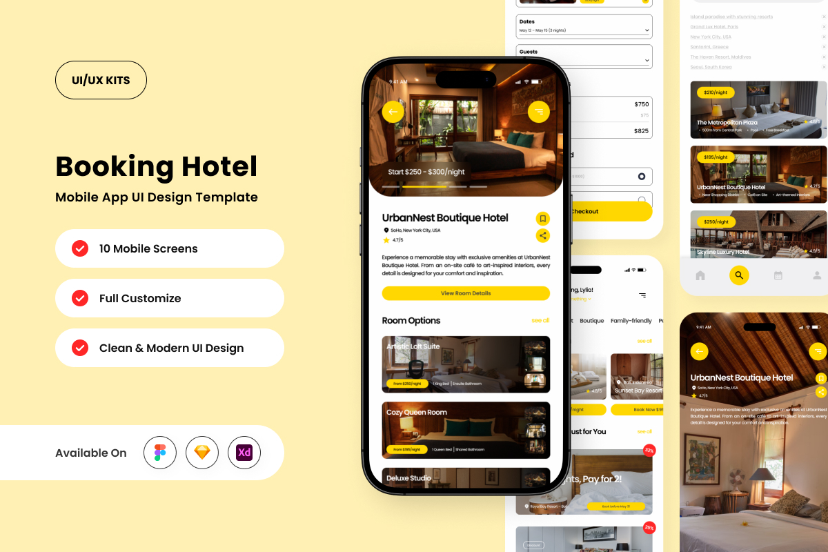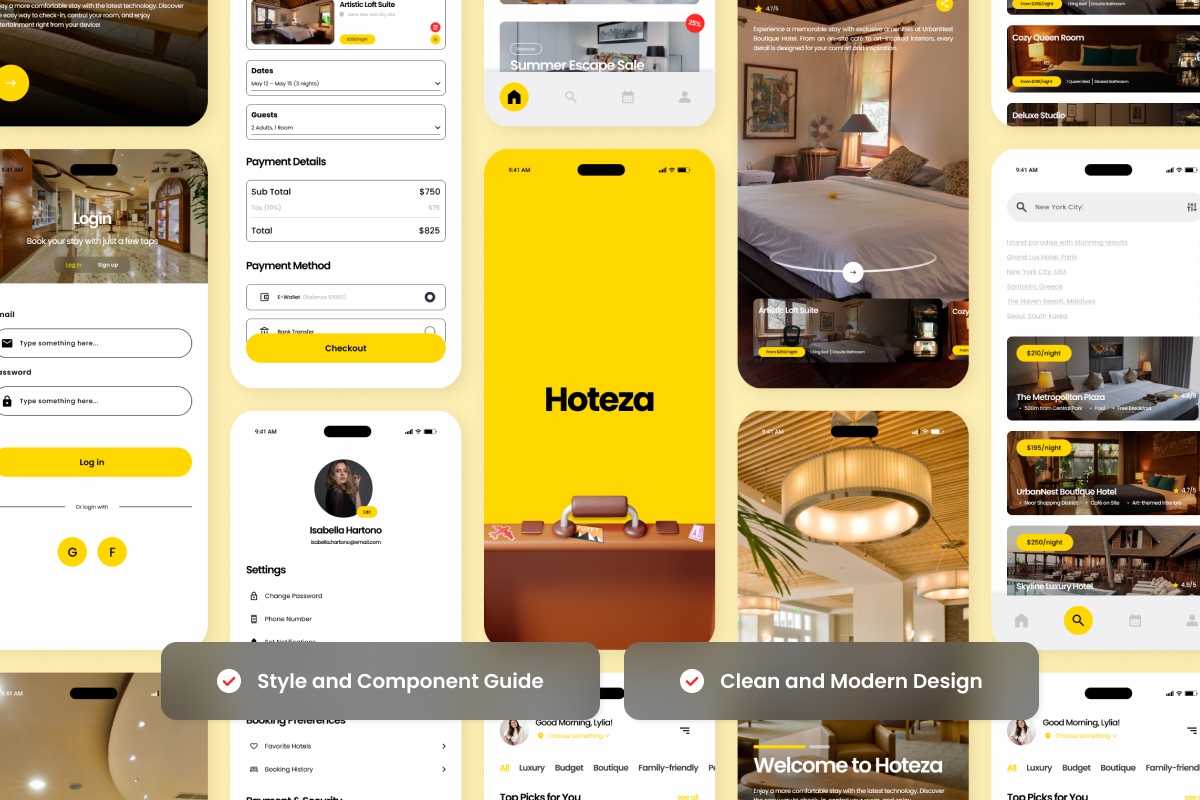 Hoteza features a minimalist design with ample white space, ensuring clarity and ease of use. Ideal for creating straightforward hotel booking applications.
