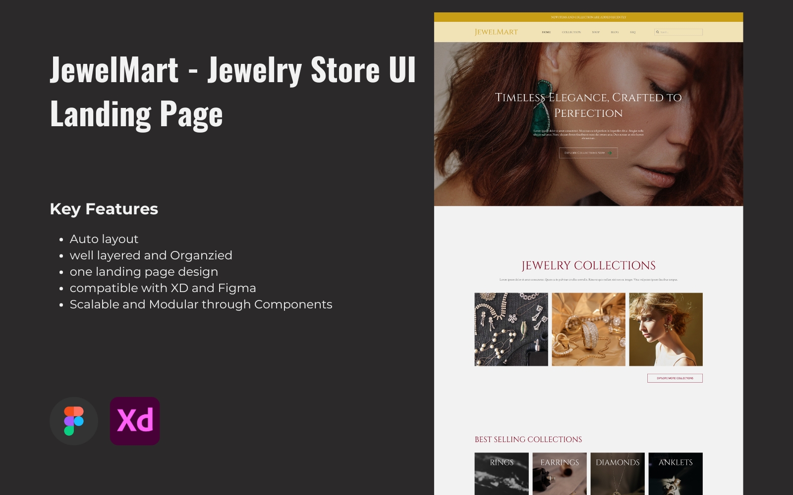 Showcase your jewelry brand with elegance and sophistication using this Jewelry UI Landing Page Template. Designed with Auto Layout, reusable components, and global styles, this template ensures a seamless design experience. Featuring a clean and modern aesthetic, it’s perfect for jewelry stores, luxury brands, and artisan designers looking to make a statement. With fully customizable elements, you can easily tailor it to match your brand identity. Elevate your online presence with a design as exquisite as your collection!
