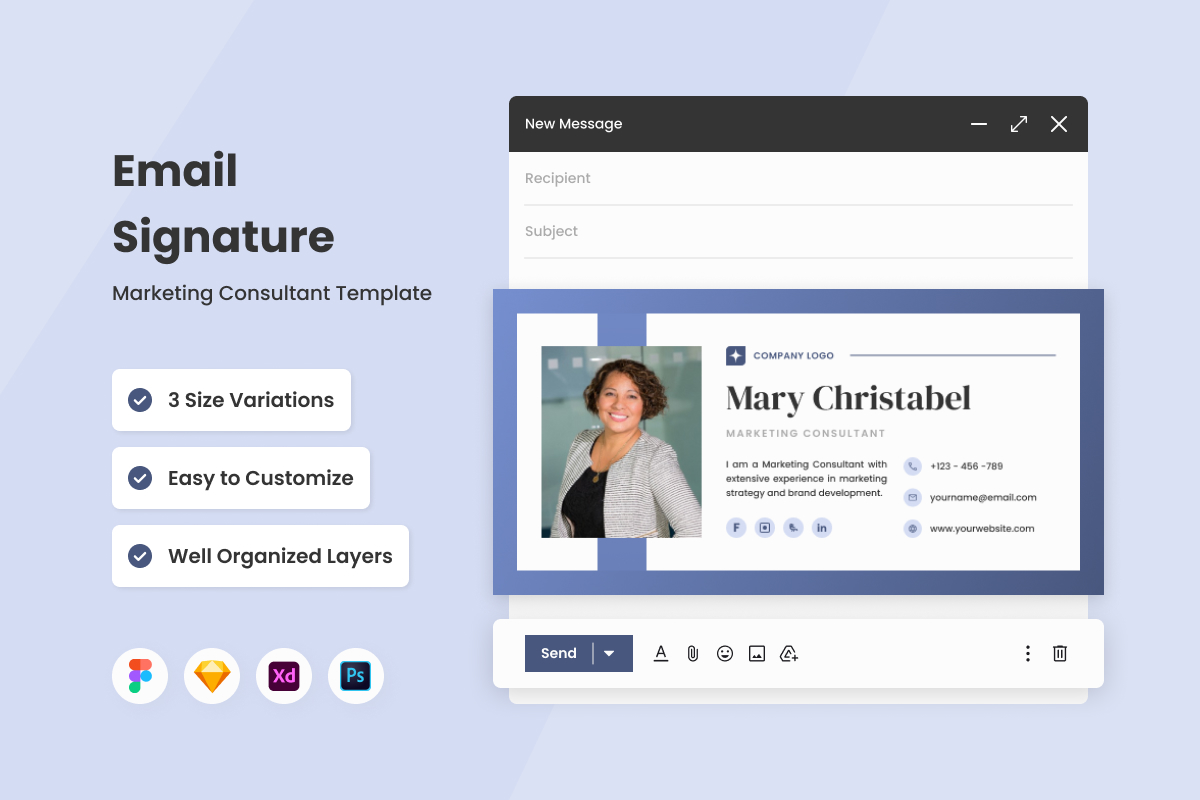 It is easy to add to your email with settings, simply drag it into the signature panel with your logo, and social profile, and you can easily change its text & color from well as Photoshop, Figma, XD & Sketch.
