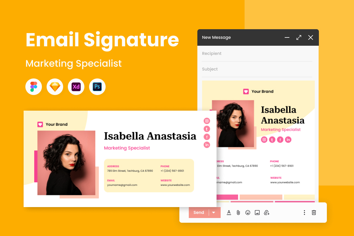 It is easy to add to your email with settings, simply drag it into the signature panel with your logo, and social profile, and you can easily change its text & color from well as Photoshop, Figma, XD & Sketch.