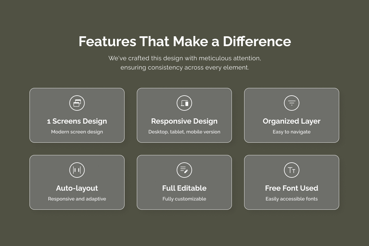 This Kit offers modular components and clean Organized Layers. The design is entirely Responsive and Adaptive, covering well-organized Desktop, Tablet, and Mobile layouts. Leveraging the Auto-Layout feature, ENERIQ allows designers and creative teams to achieve rapid customization, as all elements are fully editable and utilize only free fonts. This ensures your design workflow is highly efficient, seamless, and developer-friendly for quick deployment.