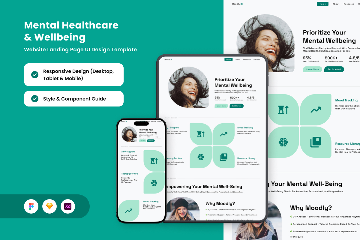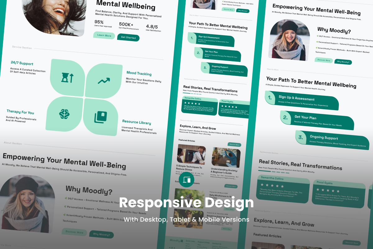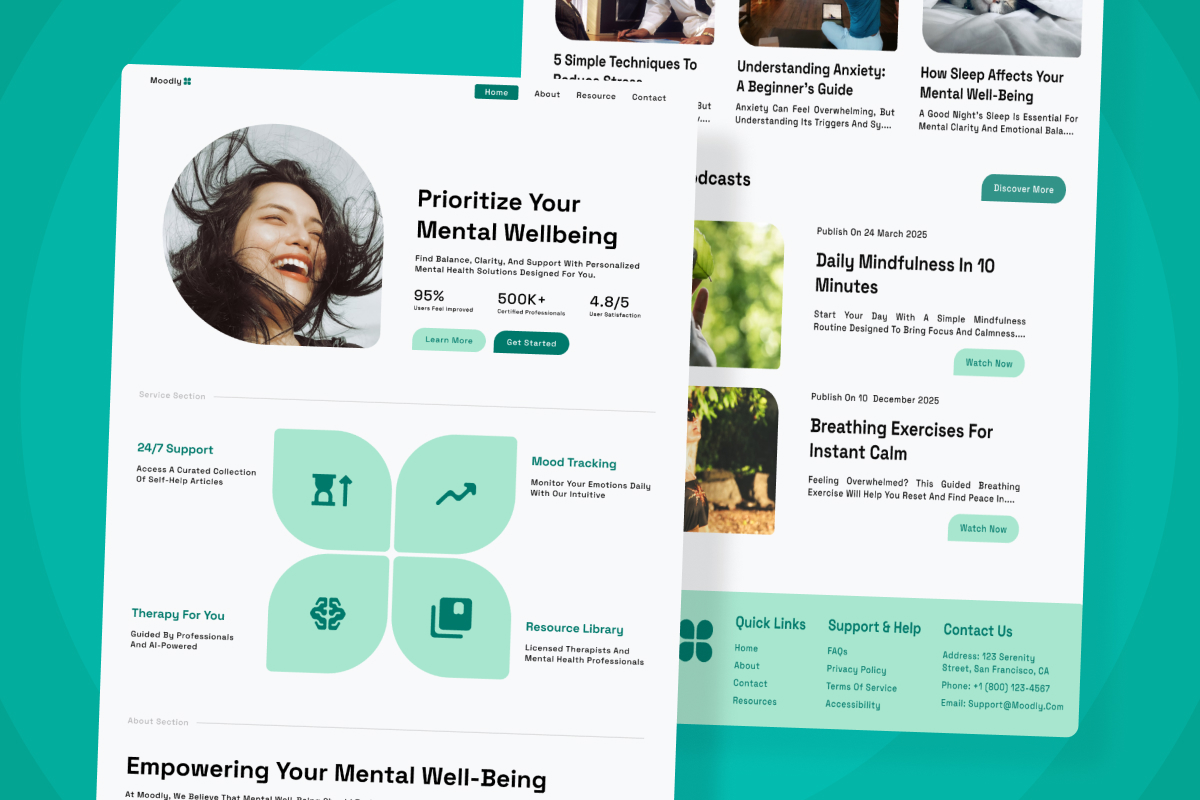 Moodly brings a calm and emotionally engaging digital experience, ideal for mental health startups and therapy brands looking to build trust through clean visuals and intuitive structure.