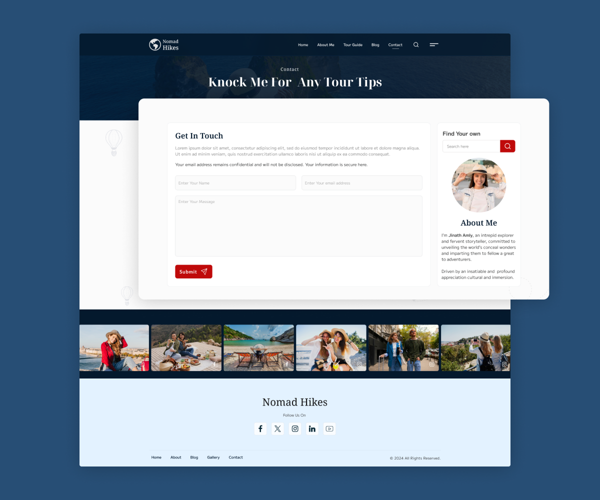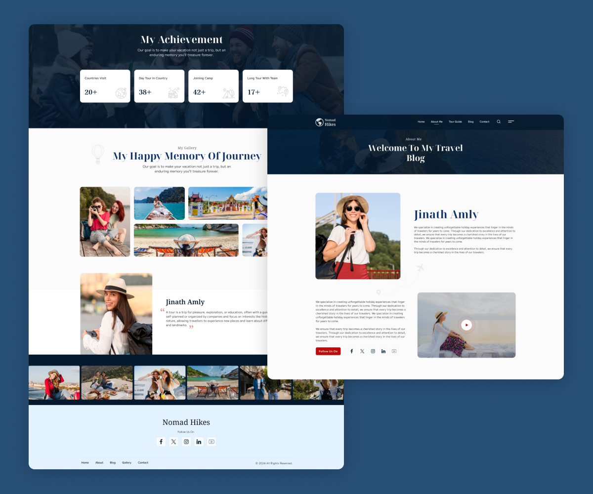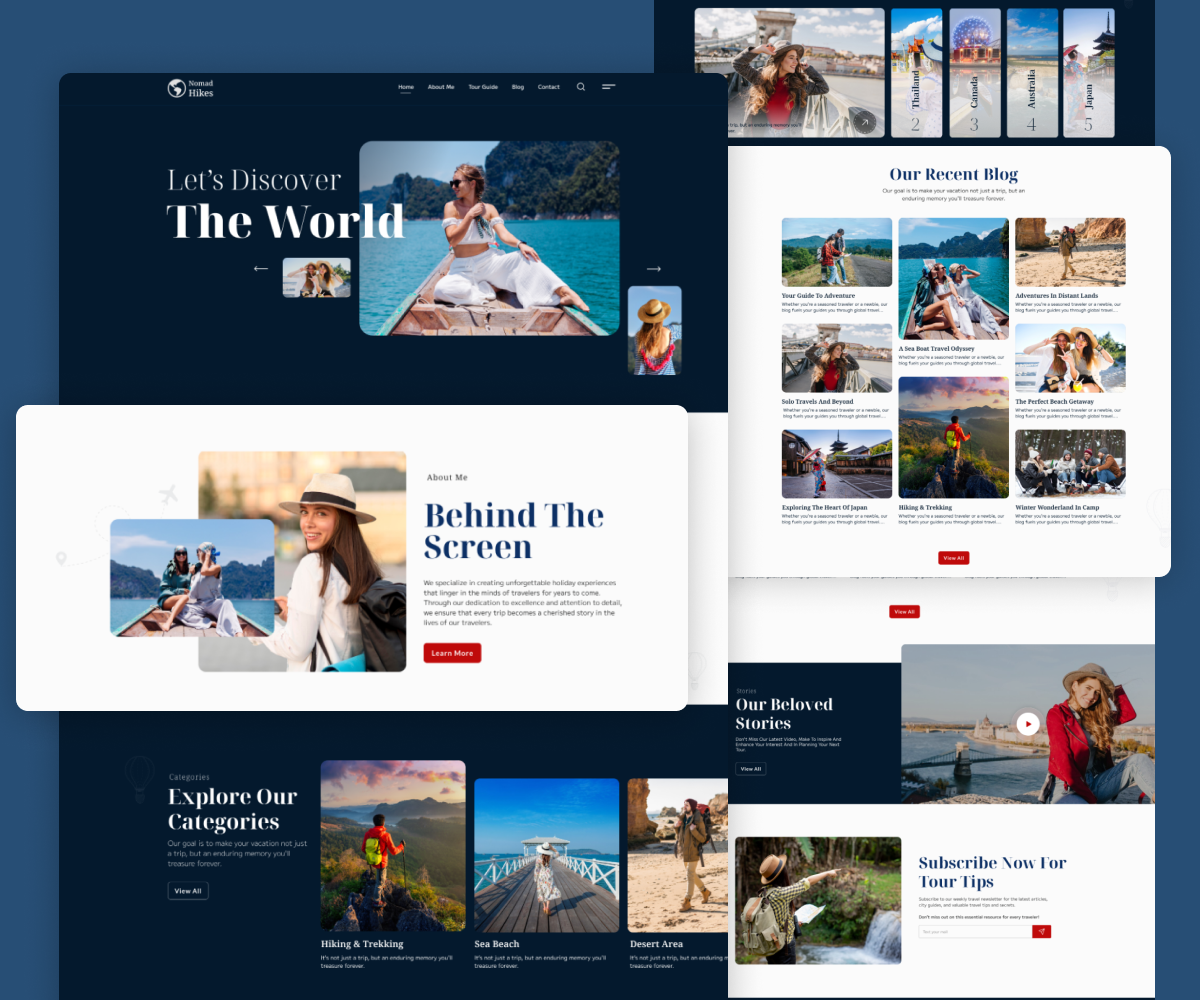 Explore Nomad Hikes, a versatile and visually striking Figma template designed for Tour Operators, Travel Agencies, and Travel Bloggers. Featuring a modern and unique layout, this template is perfect for crafting professional and eye-catching travel websites.