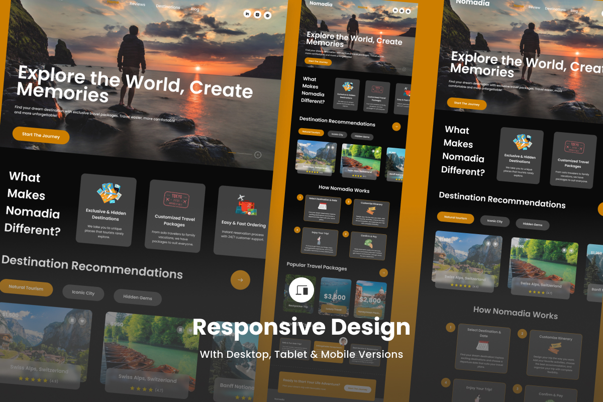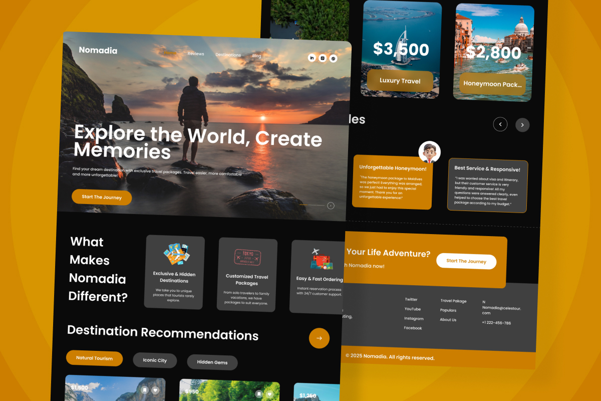 Nomadia is a sleek and immersive landing page design tailored for travel brands promoting eco-tourism, outdoor expeditions, and adventure tours. With a structured UI, nature-inspired colors, and dynamic call-to-action sections, this design ensures easy navigation and an engaging booking process. Ideal for travel startups and agencies looking to create a lasting impression.