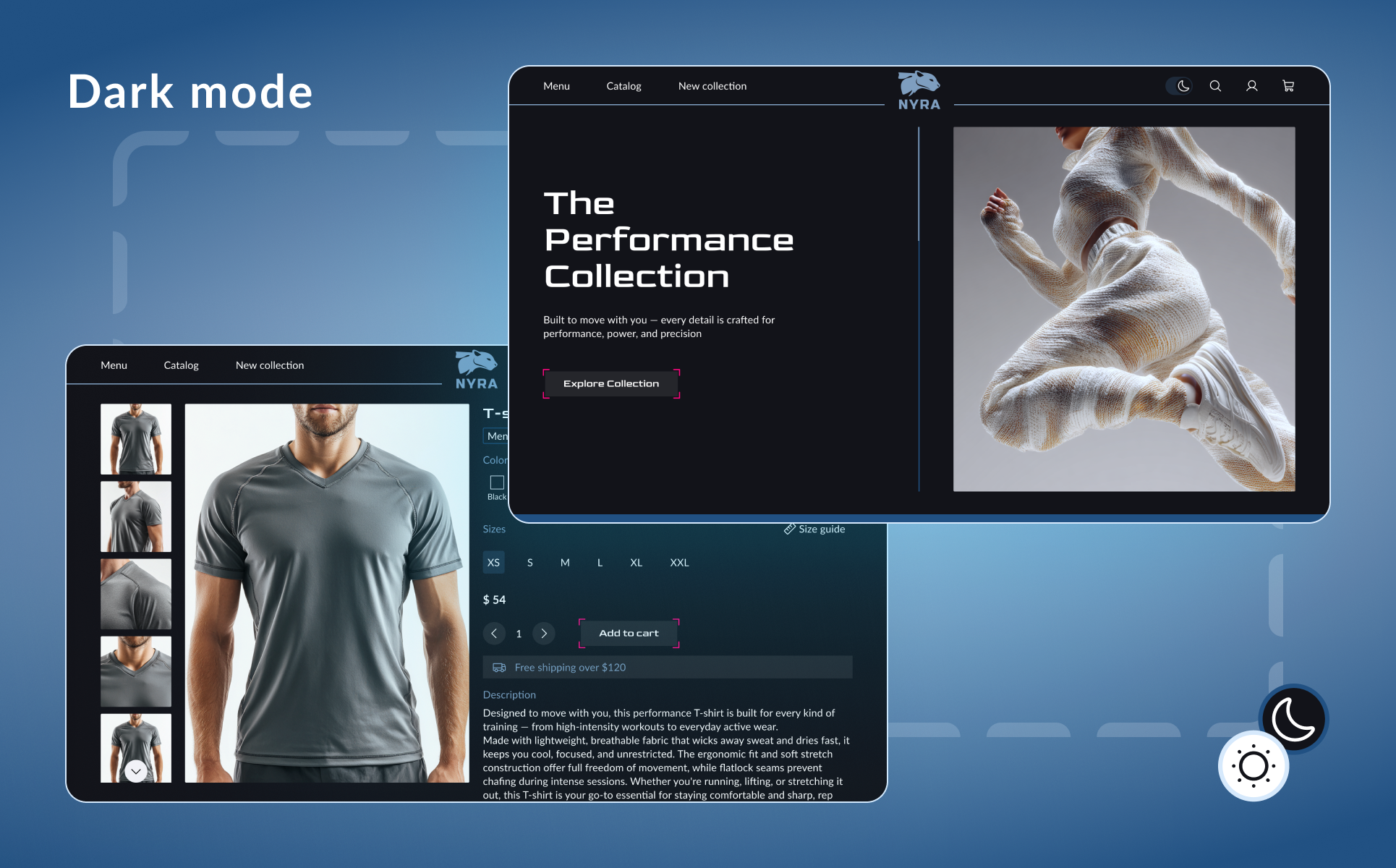 Its key feature is a fully light and dark theme, allowing you to create a visually appealing store that matches your brand’s aesthetic. With a responsive layout and mobile-optimized design, this template works perfectly for fashion, sneakers, activewear, or lifestyle collections, helping attract customers and boost sales.