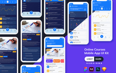 Online Courses Mobile App UI Kit (Light & Dark) Version PSD, Sketch, Adobe XD and Figma