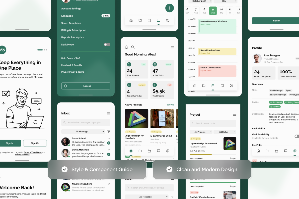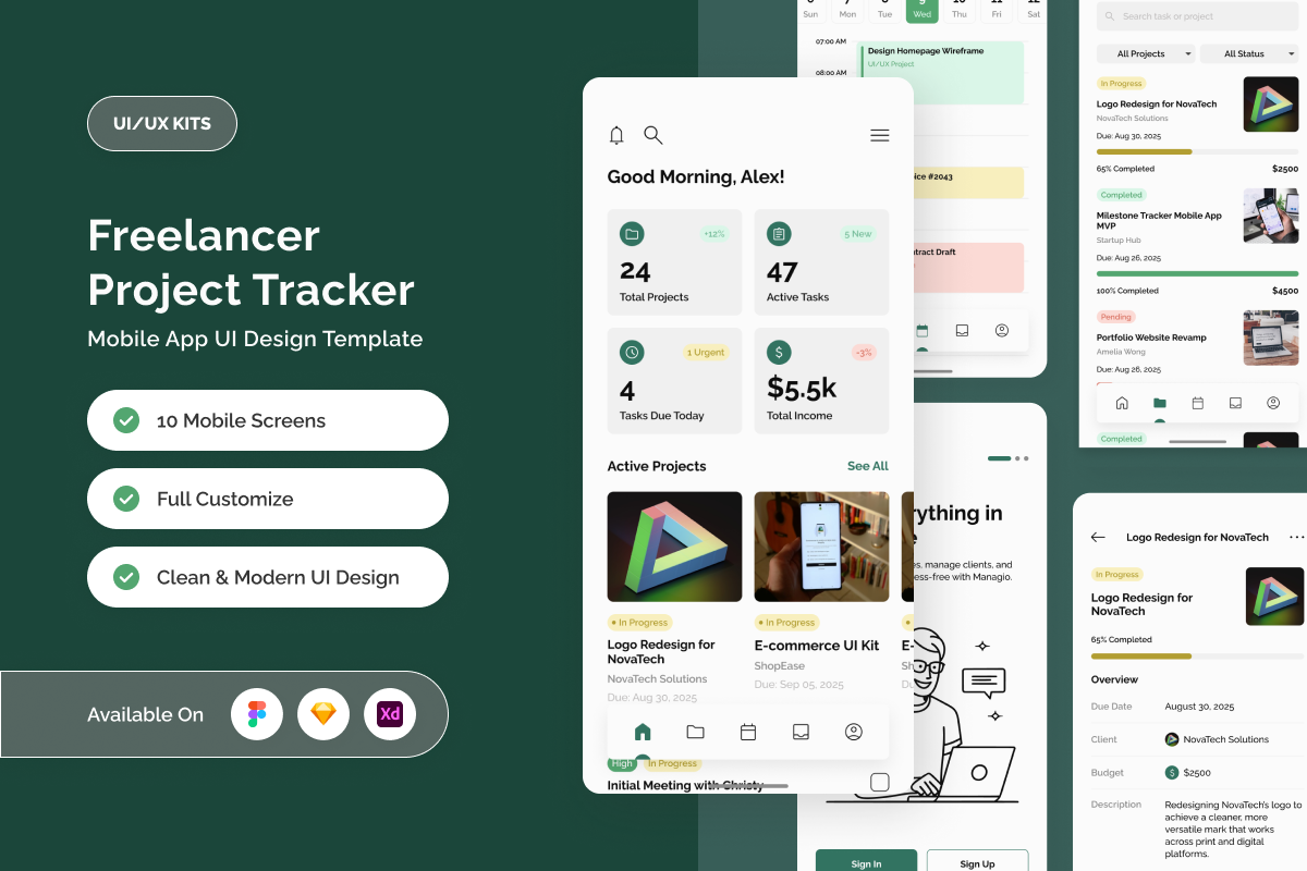 Engaging and modern UI kit crafted for productivity apps. Ideal for freelancers and professionals who need to manage projects, monitor timelines, and visualize progress with sleek dashboards.