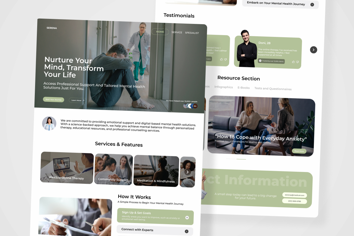 Serena is a serene and user-friendly landing page design for wellness and therapy professionals. Its inviting layout and emotional visuals help build trust and comfort for mental health seekers.