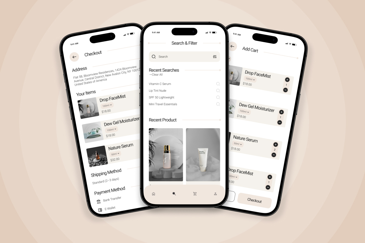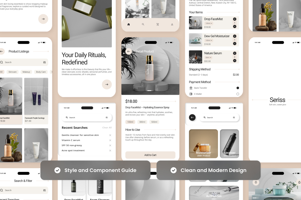 Seriss is a modern minimalist skincare UI kit featuring smooth user flow, adaptive components, and balanced color schemes. Perfect for startups and indie skincare brands launching apps.