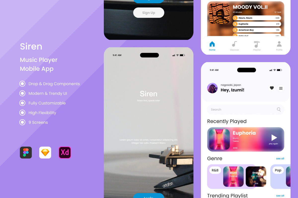 Embrace the thrill of music with Siren, a music player app that puts the magic of melodies at your fingertips. This design is a gateway to an infinite world of sound. With a structured layout and clean, simple, and elegant colors, this application is designed to give you an immersive experience in listening to music. Discover the ease of organizing your music collection and let the tunes fill your space.