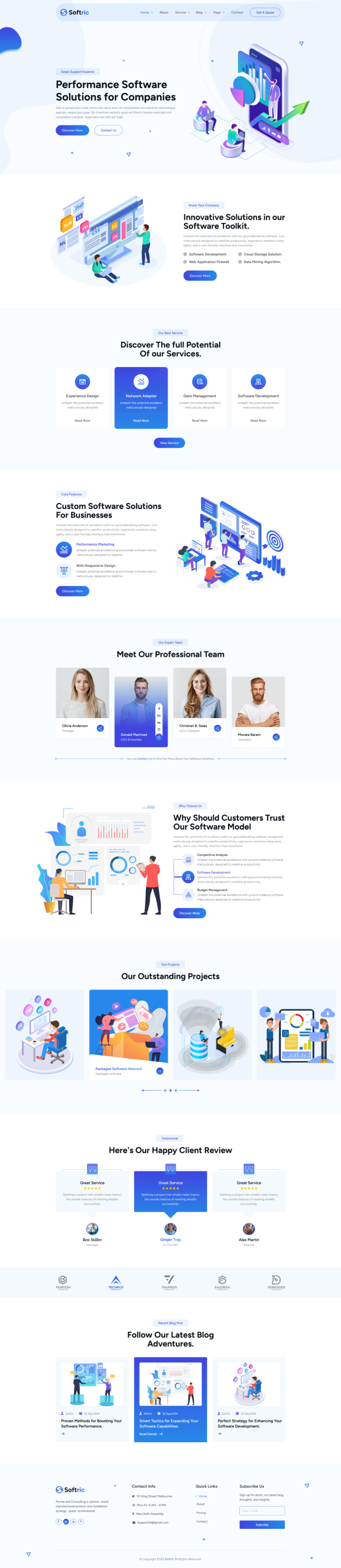 Softric - Software Company Figma Template clean, pixel perfect and modern design. It's editable and customizable. It is perfect for a Software, Saas, Computer software. Software Startup, IT Solution and Technology business. Since it is 100% customizable, you can edit this template HTML, WordPress React, Joomla and any other platform you like.