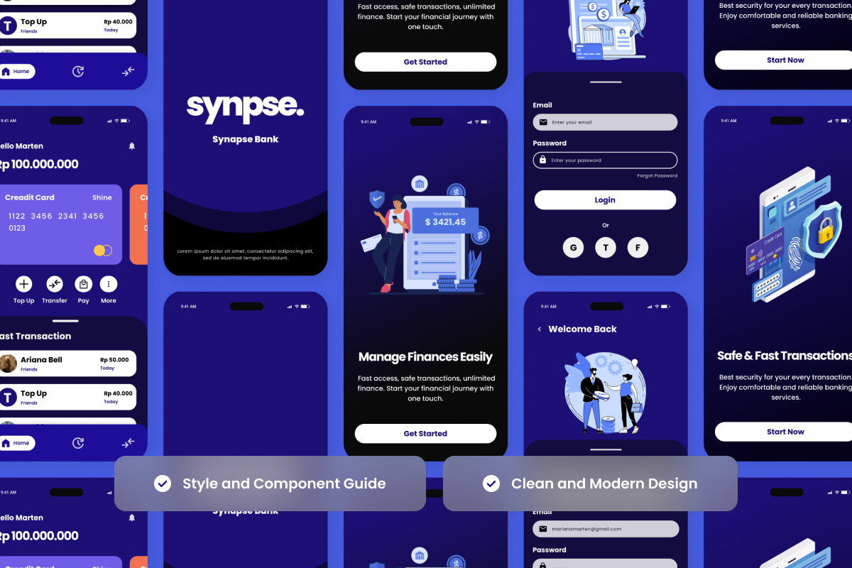 SynapsBank brings a refined and cutting-edge UI design tailored for digital banking and financial apps. With its smart and user-centric approach, this UI kit ensures seamless interaction, enhancing user engagement with a clean, modern interface. The gradient color palette and structured typography create an aesthetically pleasing and highly functional design. Ideal for fintech startups, financial management platforms, and online banking services looking to provide a superior user experience.