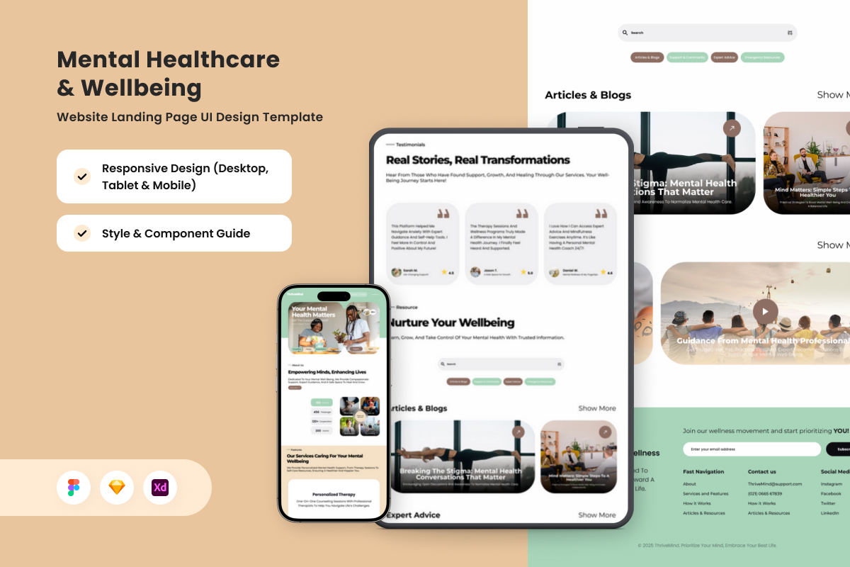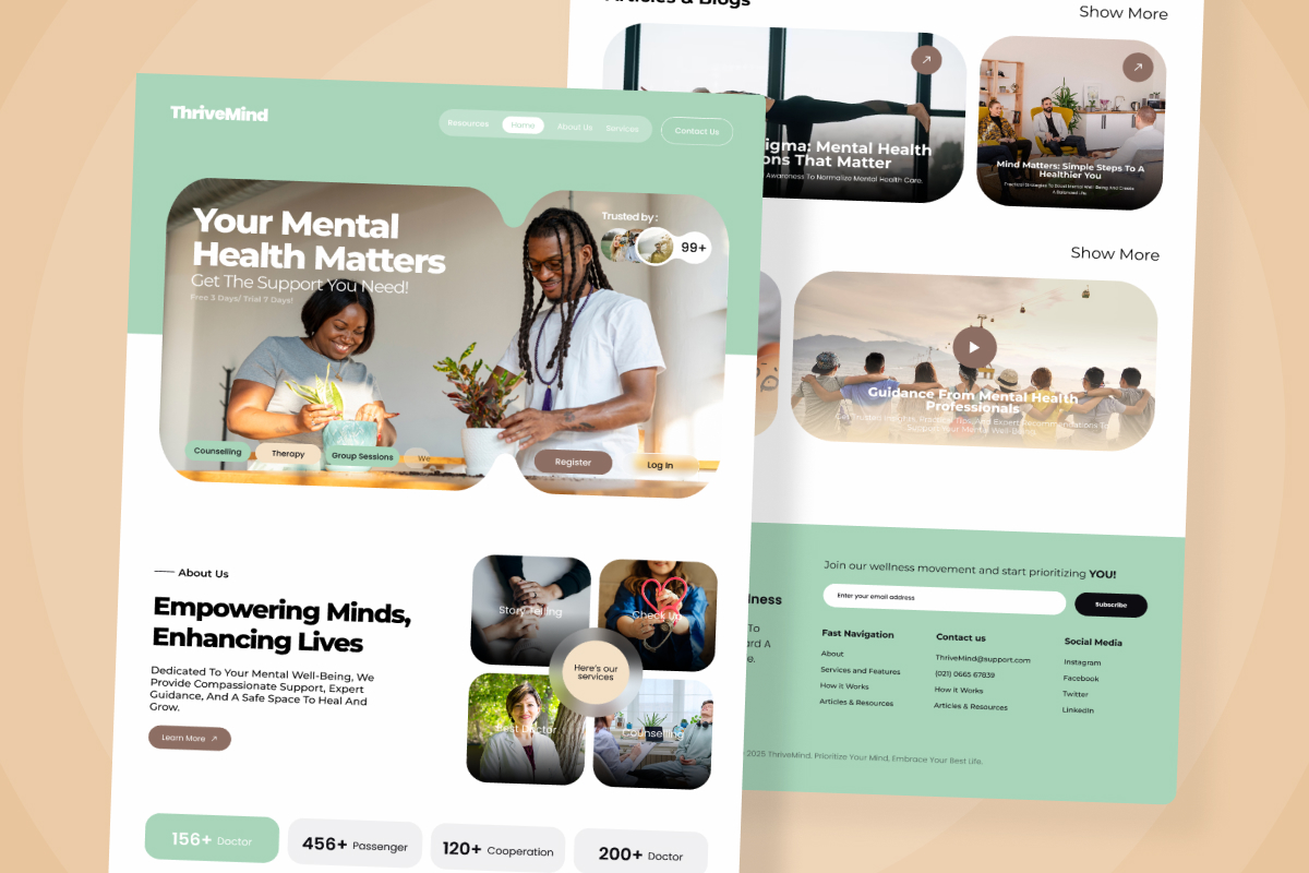 ThriveMind is ideal for psychologists, life coaches, and wellness centers. Its modern design and friendly tone foster emotional connection and professional trust from first impression.