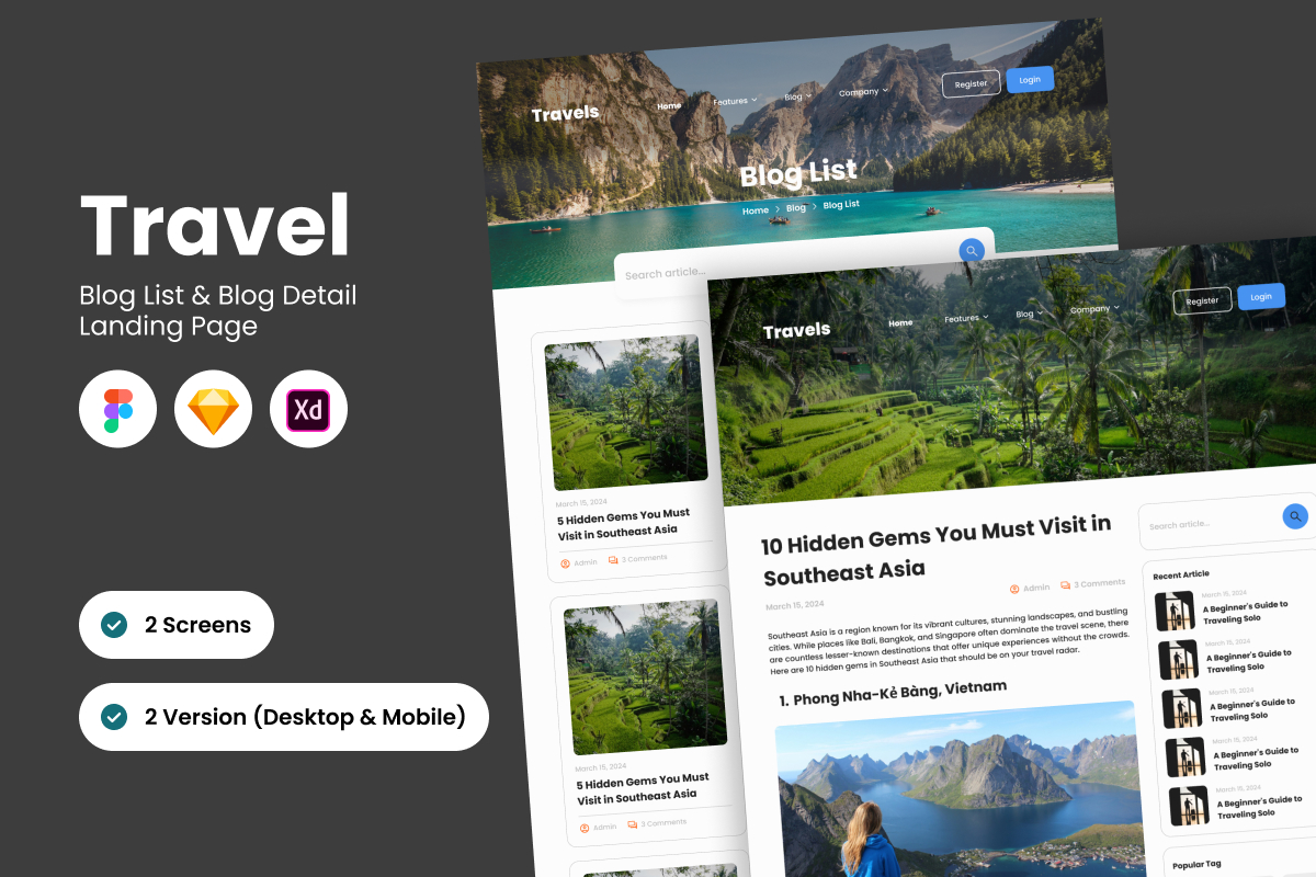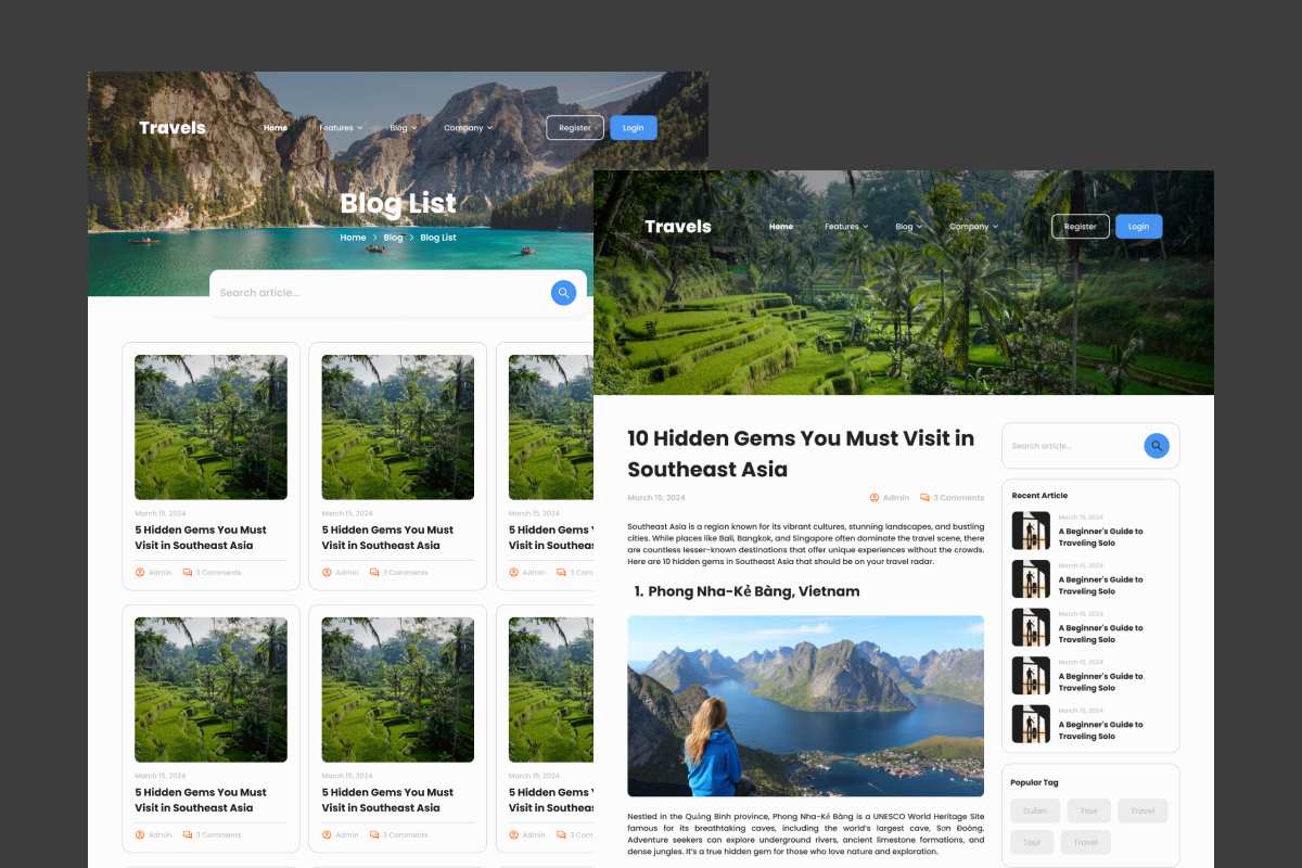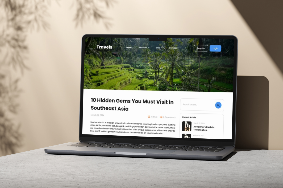 Share your travel experiences with style using the Travel Blog Landing Page Design. Designed for bloggers and travel enthusiasts, this layout focuses on clean aesthetics and vibrant elements to bring stories to life. Engage your audience with a visually captivating design that highlights photos, articles, and personal adventures in a professional, creative manner.