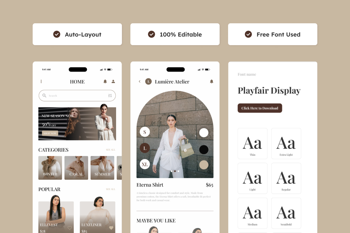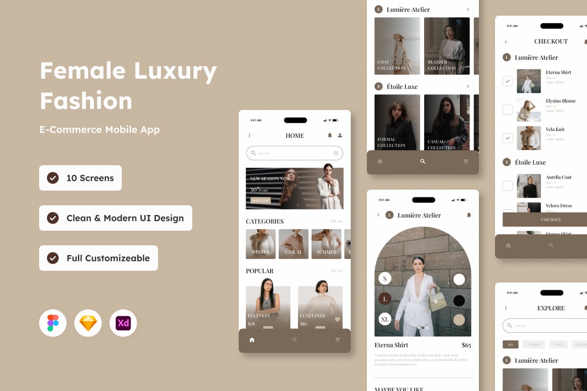 A sophisticated and modern mobile app design tailored for luxury female fashion e-commerce. With elegant layouts and intuitive navigation, it’s perfect for showcasing premium collections, offering a seamless shopping experience, and reflecting the exclusivity of high-end brands. Fully customizable and responsive, this template is designed to captivate fashion-savvy customers.
