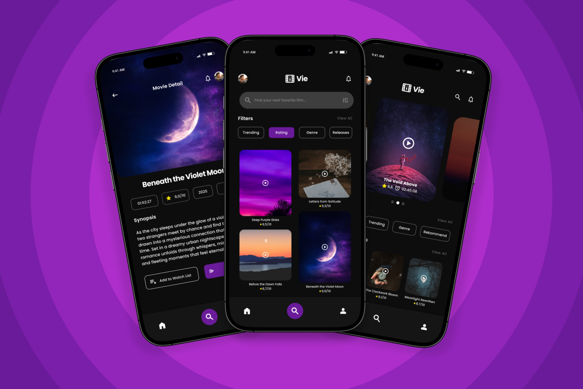 Discover seamless movie streaming with Vie, a stylish mobile app design that balances a minimalist approach with futuristic glassmorphism elements. Ideal for creating a premium entertainment platform with high-quality visuals and smooth navigation flow.**Highlights:**