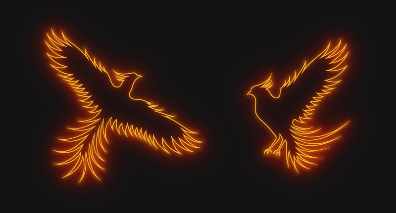 A neon outline of red orange phoenix with wings, isolated on the black background. A set of vector illustrations. Can be used as an animal and bird clip art template, as a decoration for the web (banners, posters), and for printing. Color mode is RGB. Available in AI, EPS and JPEG formats.