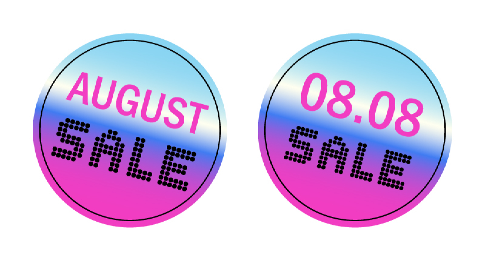 August sale round stickers set with a holographic glossy gradient, Barbie pink color and black dotted font. Can be used as a sale sticker template in online and offline shops, also in social media ads. Color mode is RGB. Available in AI, EPS and JPEG formats.