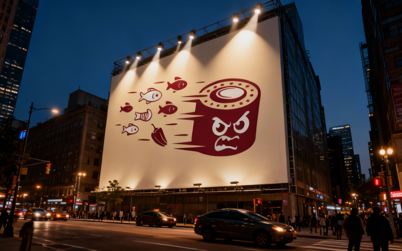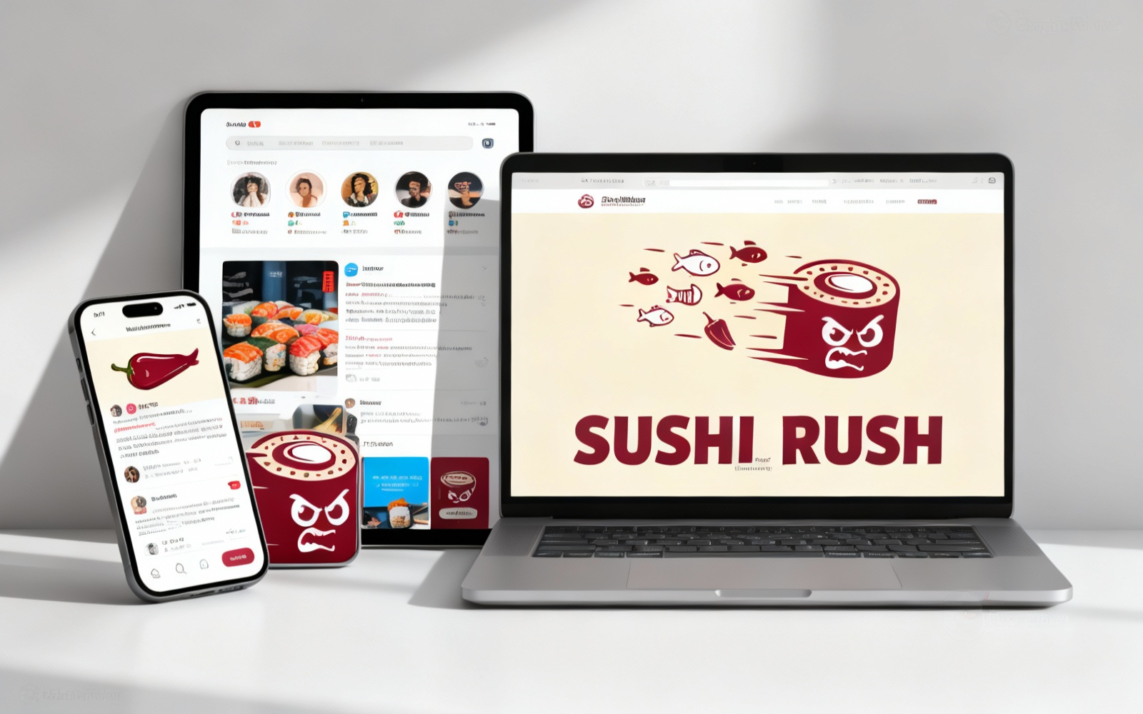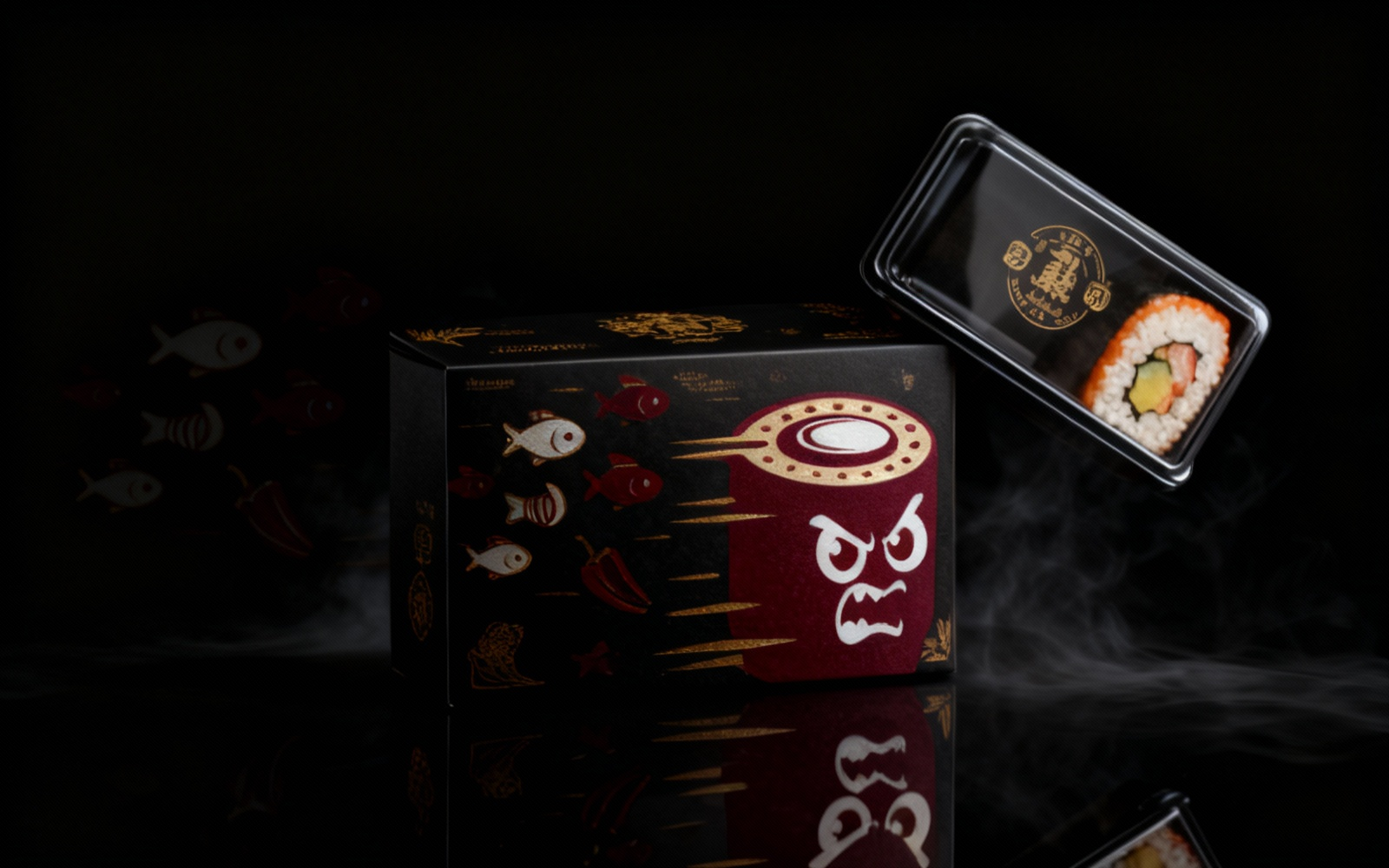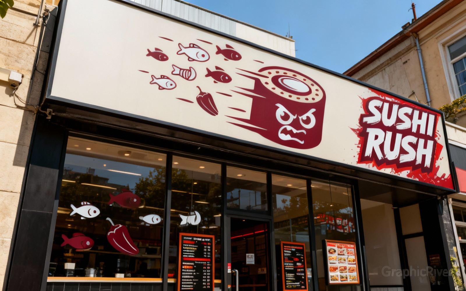 Angry Sushi Cartoon Mascot is a funny and creative vector illustration featuring a sushi roll character running with chili peppers and a fish. Perfect for t shirt prints, logo design, branding, stickers, book covers, mugs, posters, packaging, and digital artwork.