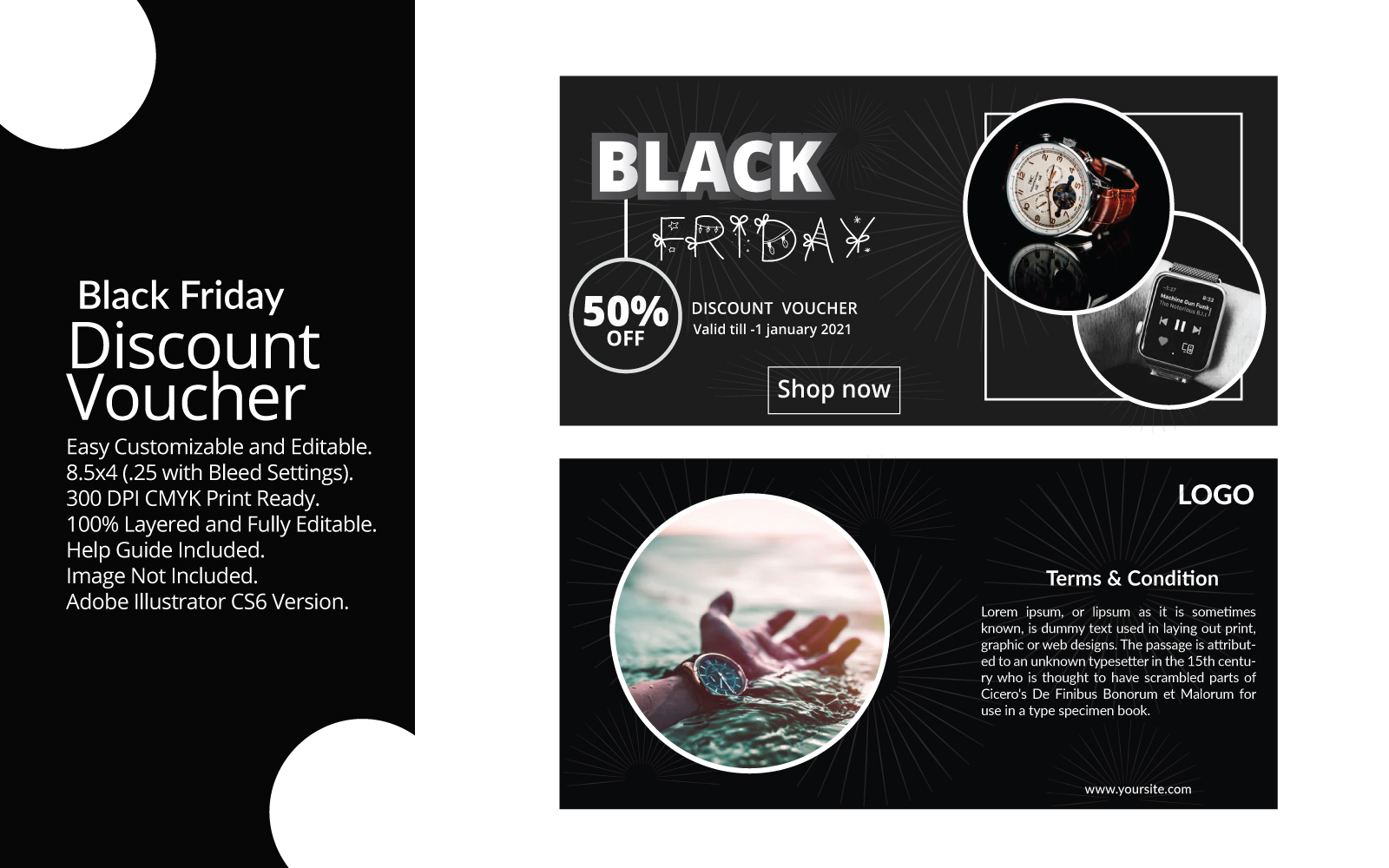 This is a Black Friday Discount Voucher Template. This Template Download Contains a 300 DPI, Print-Ready, CMYK,AI File.